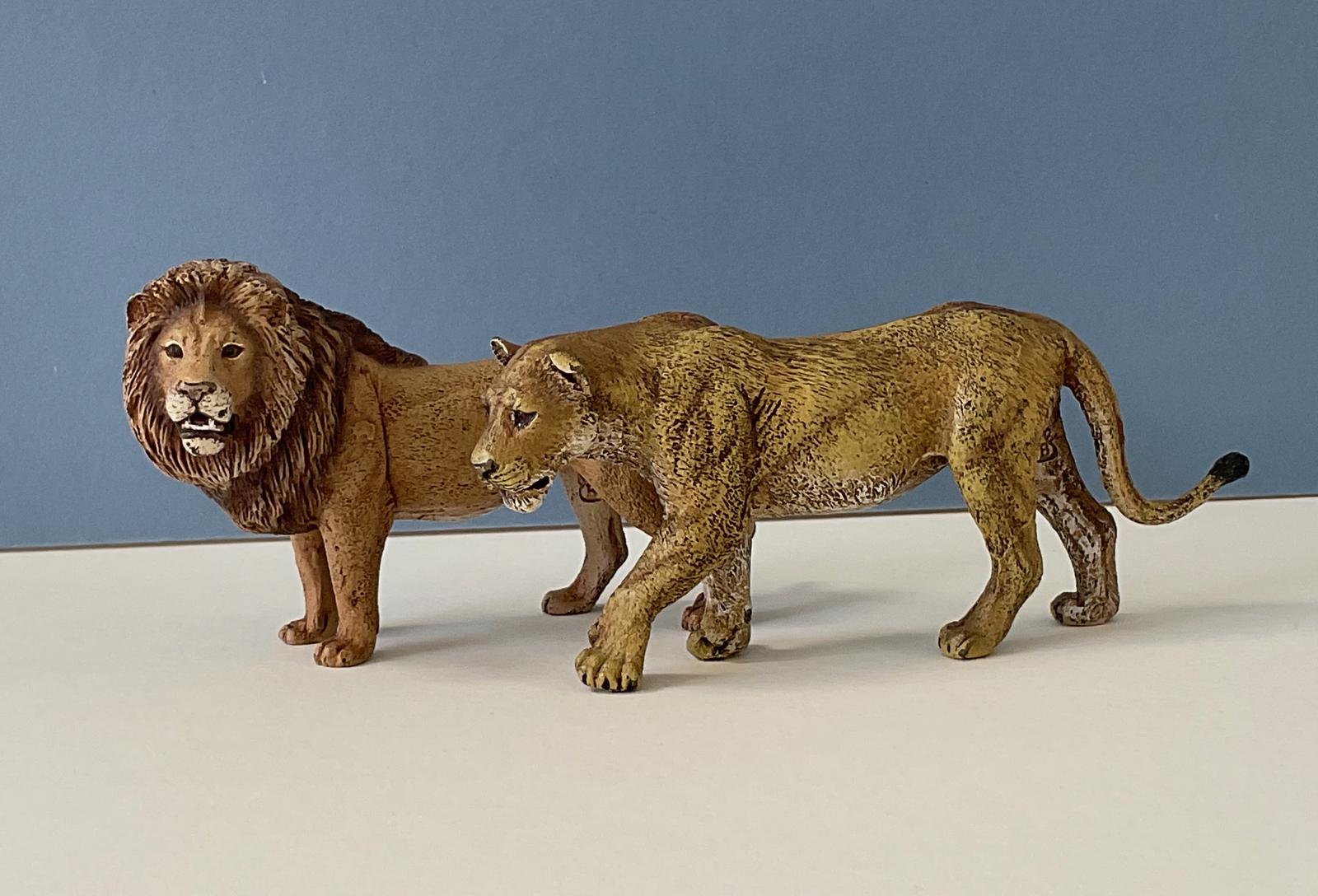 They date from around 1900 and both carry clear maker's marks on their hind legs. The lion is slightly taller and shorter than the lioness. The detailing on these sculptures is fabulous and there is little paint loss.