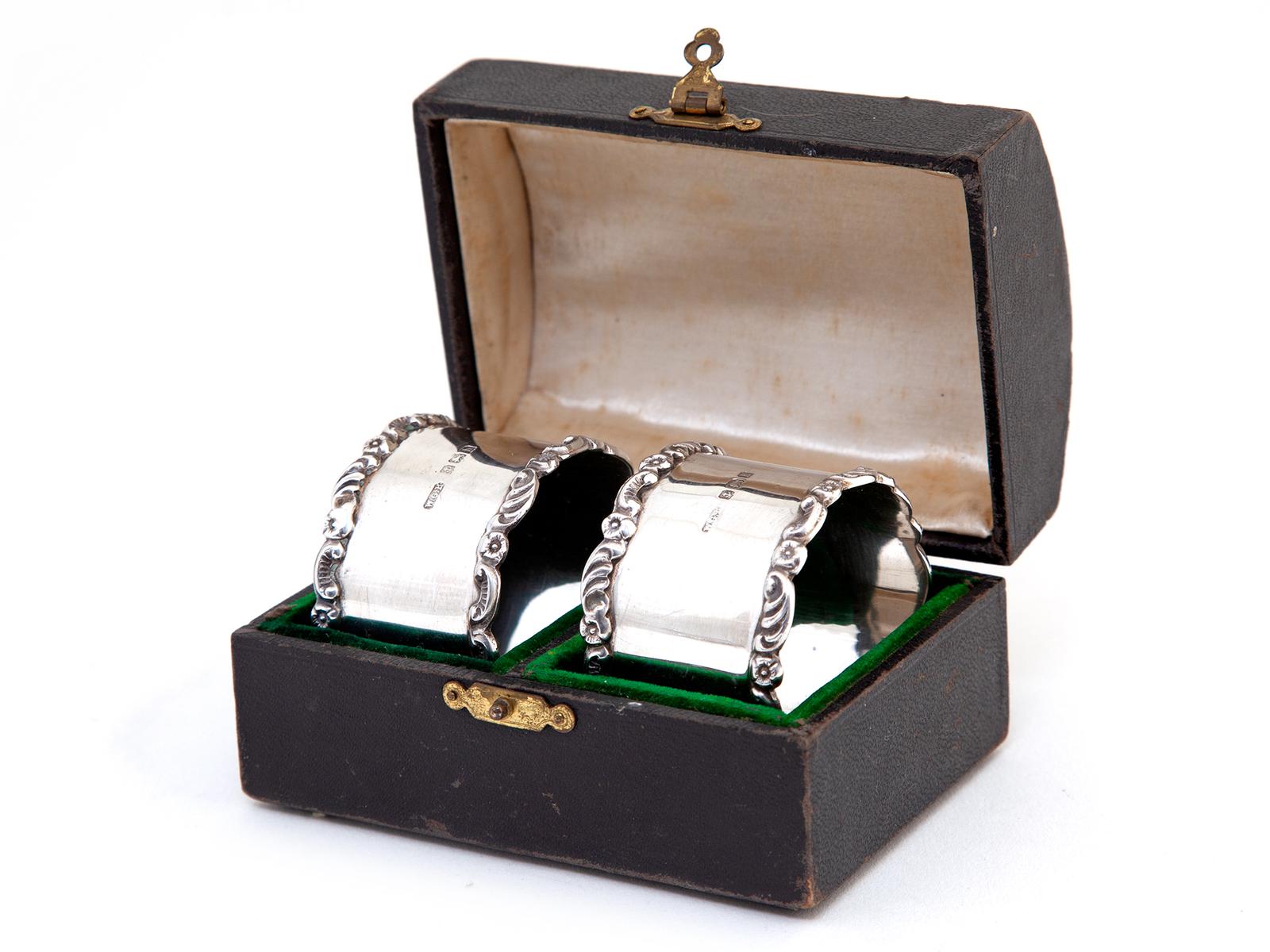 Pair of Boxed Edwardian Silver Napkin Rings with Plain Bodies and Floral and Scroll Borders (1 of 5)