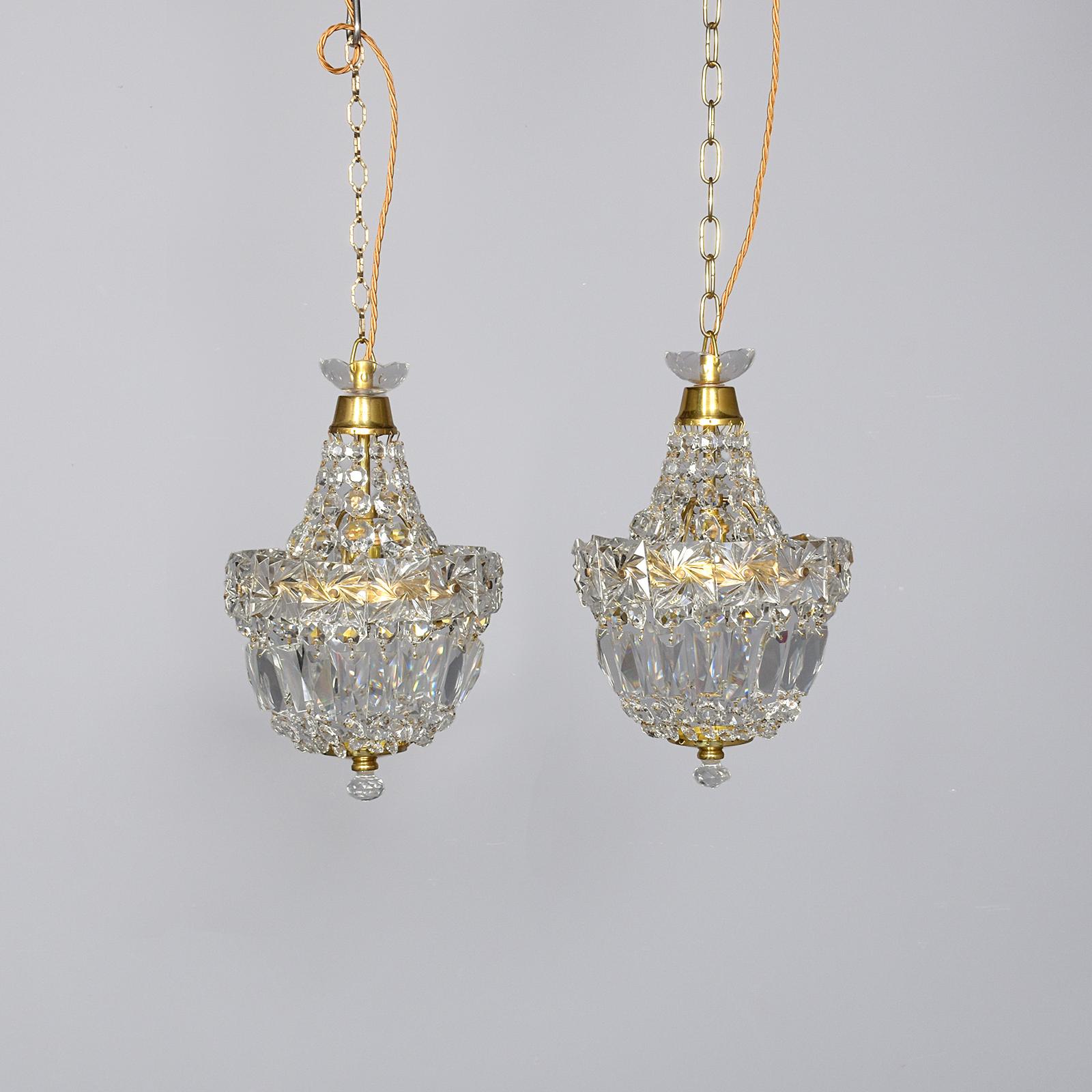 Circa 1930s. A stylish pair of neat-sized brass and crystal light fittings, the glass corona with brass downward-facing bezel, the tent and bag chandeliers with single lamp fitting with tapering facets of glass and central brass bezel with large squares of engraved glass, the base has Various-shaped glass crystals finishing with a brass base with downward facing crystal. (Recently cleaned and re-wired)