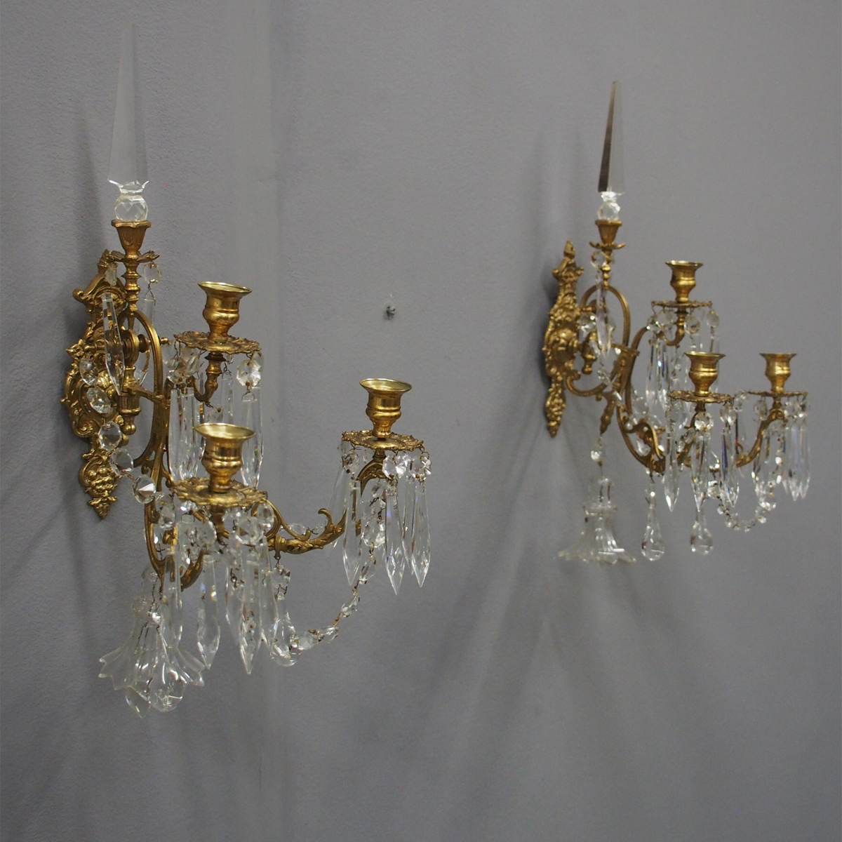 Pair of Brass & Cut Crystal Wall Sconces c.1890 (1 of 10)
