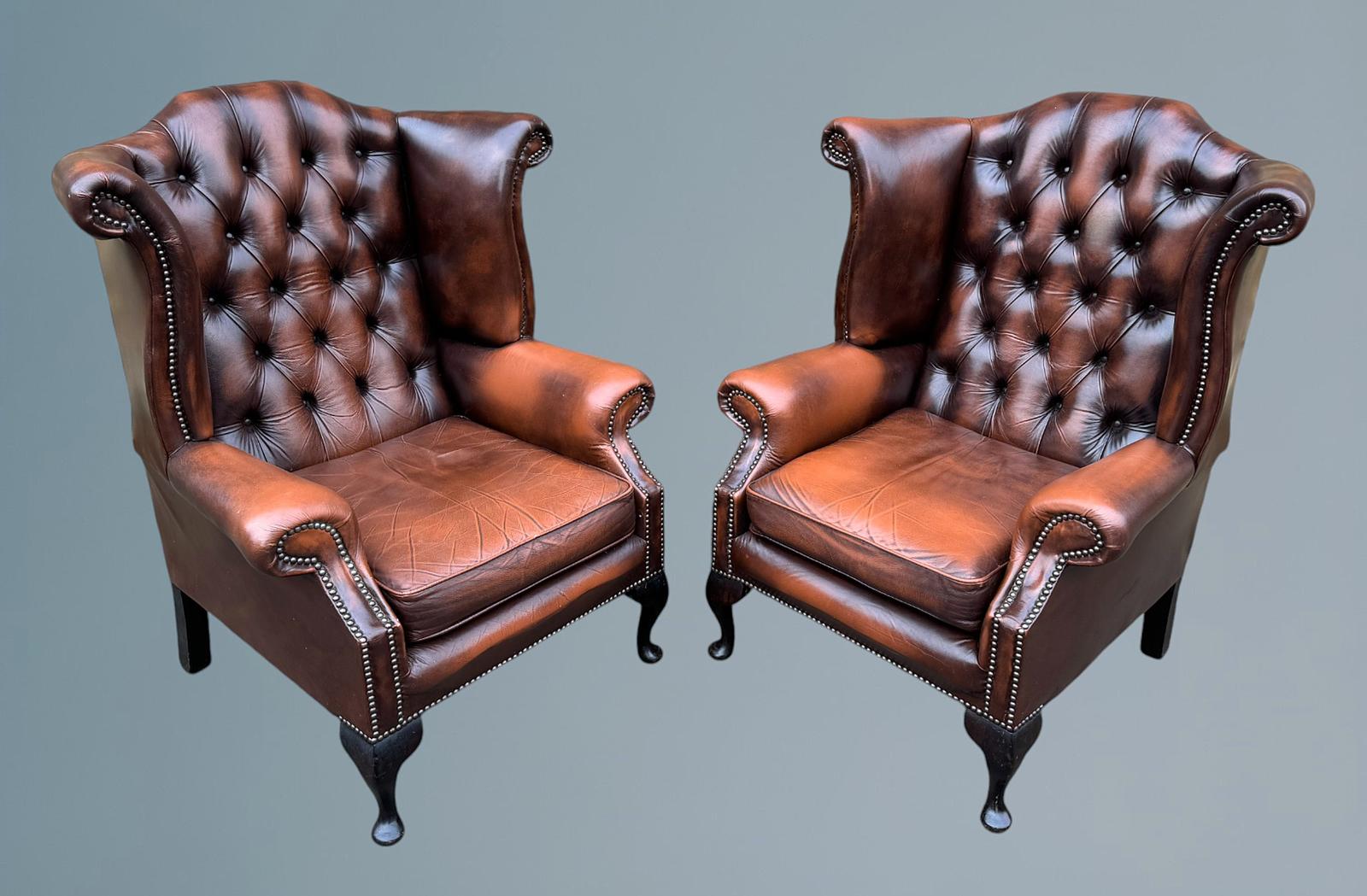 Pair of Brown Leather Queen Anne High Back Chesterfield Arm Chairs