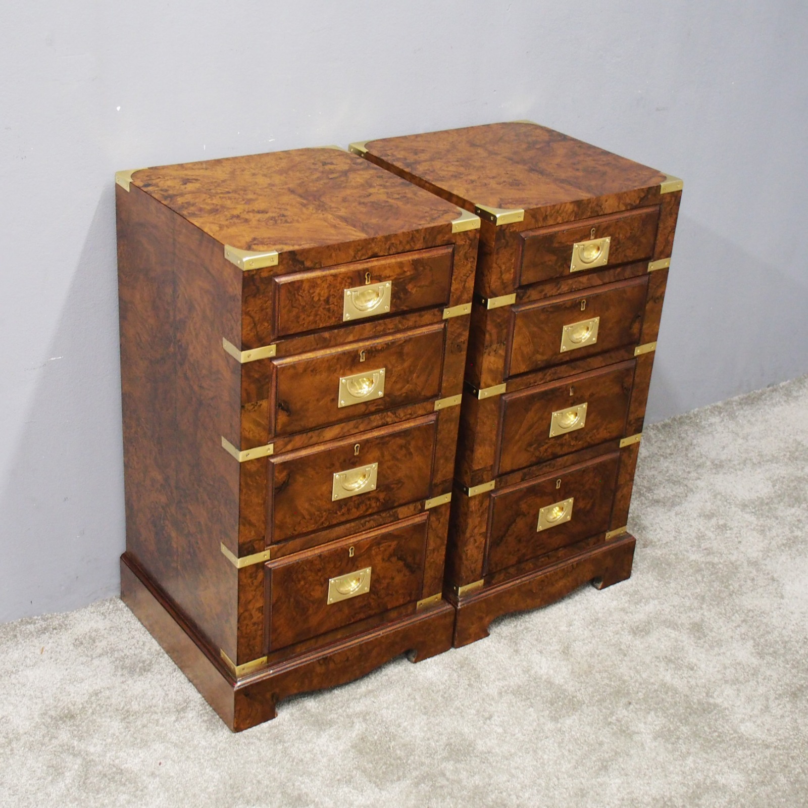 Pair of Burr Walnut Military Style Bedsides or Chest of Drawers