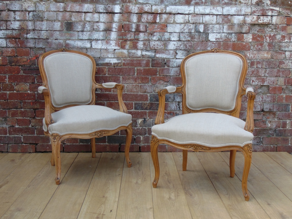 Pair of Carved Beech Wood Reupholstered Fauteuil Armchairs