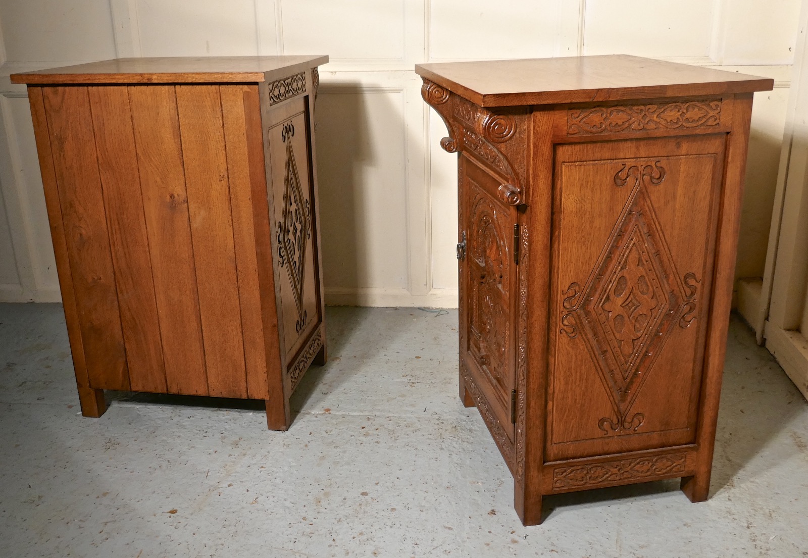 Pair of Carved Gothic Golden Oak Bedside Cupboards