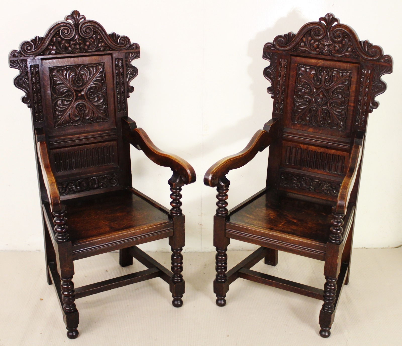 Pair of Carved Oak Wainscot Armchairs c.1880