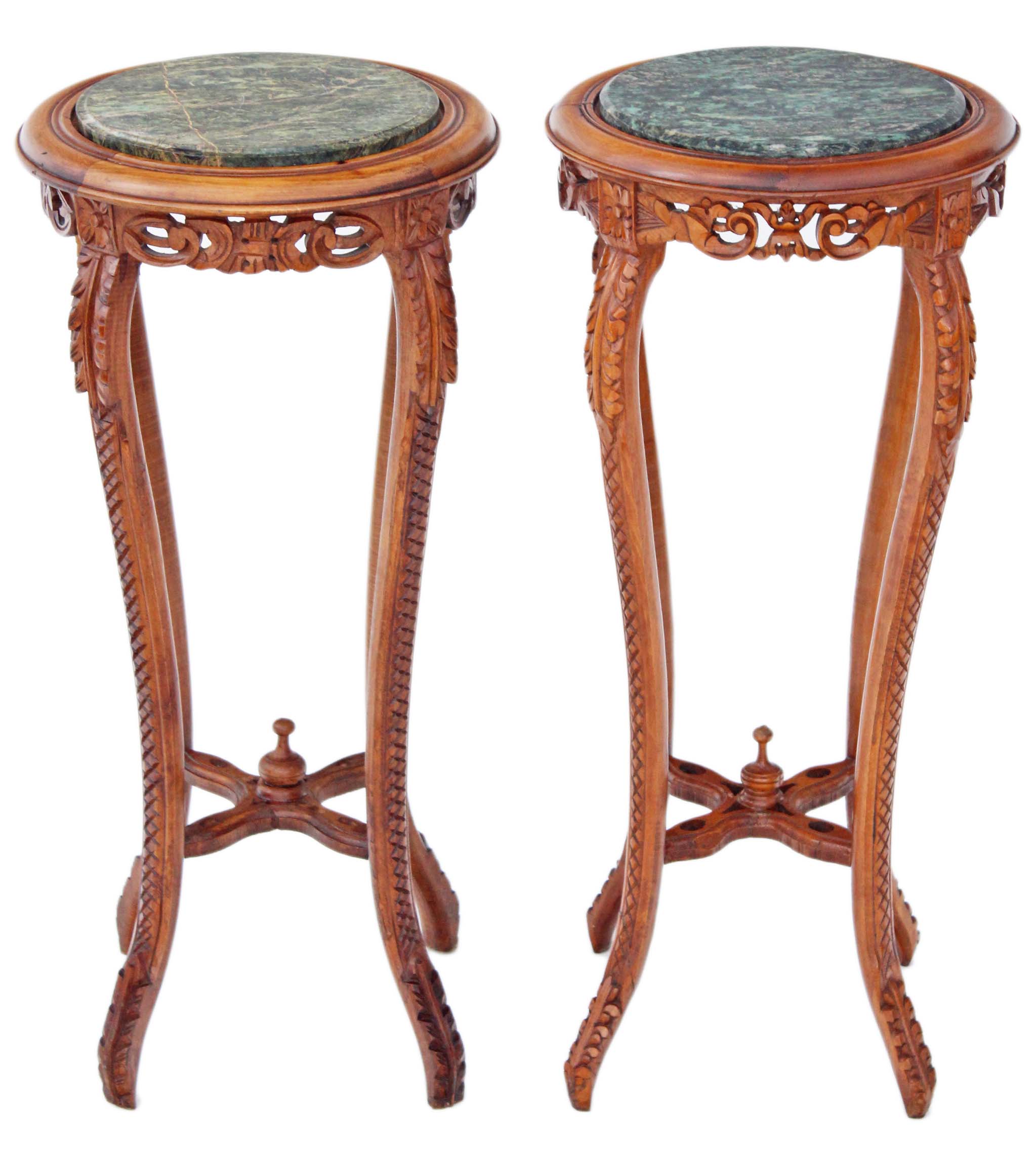 Pair of Carved Walnut Beech Marble Jardinière Touchier Plant Table Stands
