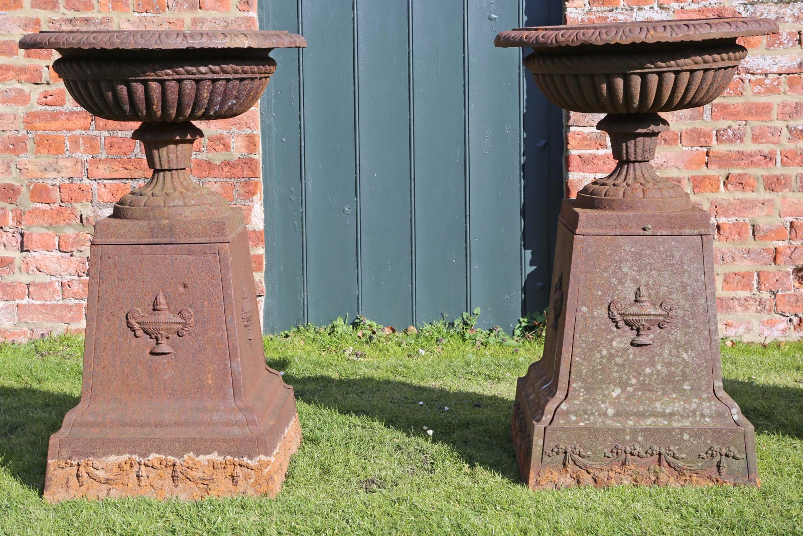 Pair of Cast Iron Planters Classical Urns on Plinths