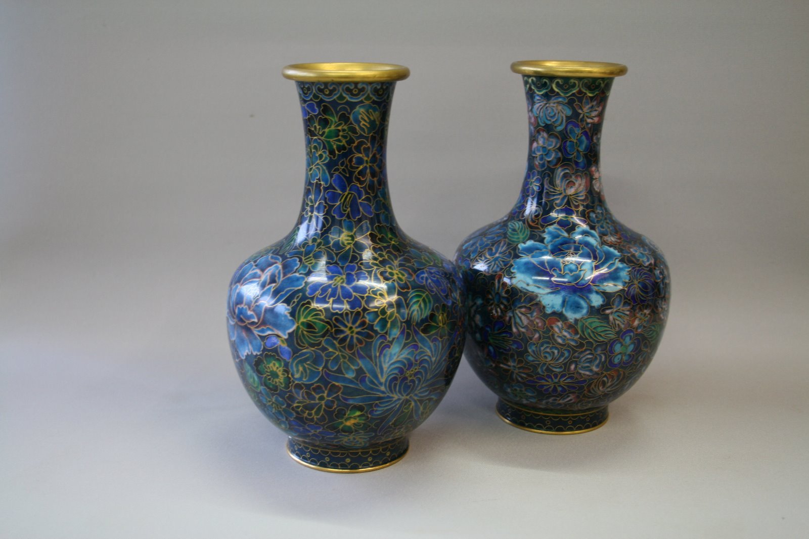 Pair of Chinese Cloisonne Vases with Midnight Blue Background (1 of 1)
