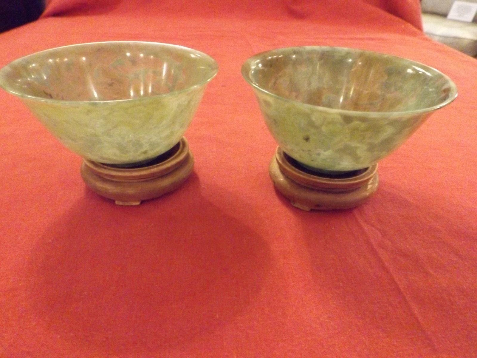 Pair of Chinese Jade or Jadite Spinach Bowls On Stands