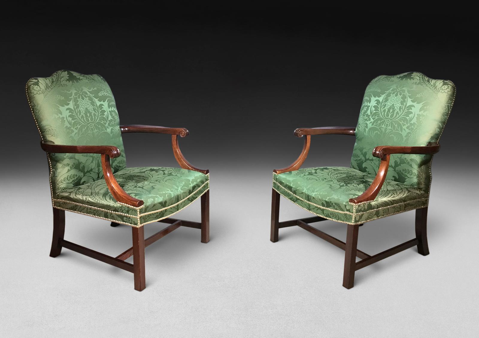 An exceptional PAIR of mid-18th. Century Mahogany Gainsborough Chairs, the arched backs flanked by shaped, scrolled, moulded and carved arms and terminals, the saddle shaped seats raised on square section chamfered legs united by an “H” stretcher.