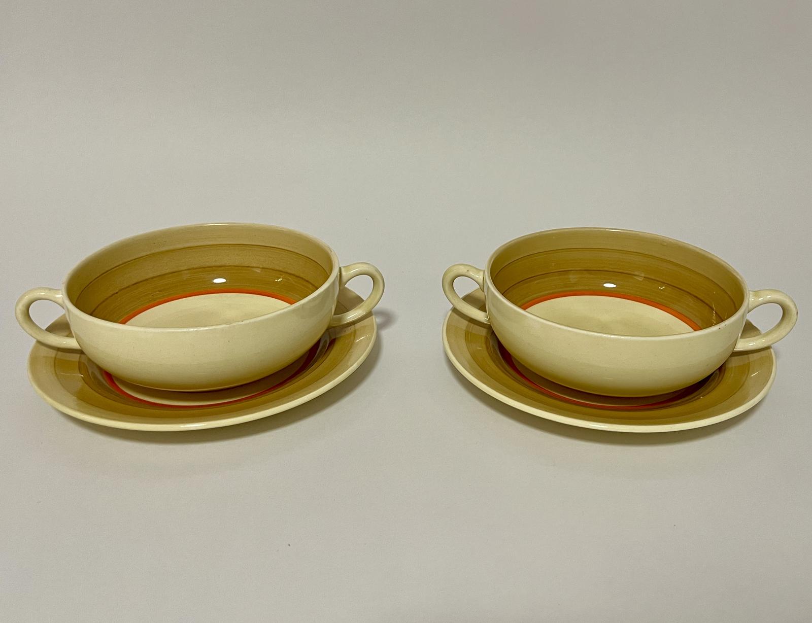 A matching pair of Clarice Cliff soup bowls with matching saucers dating from the 1930s. They are decorated with hand painted bands in shades of brown and orange. The soup bowls have two small handles and they sit nicely on the saucers.