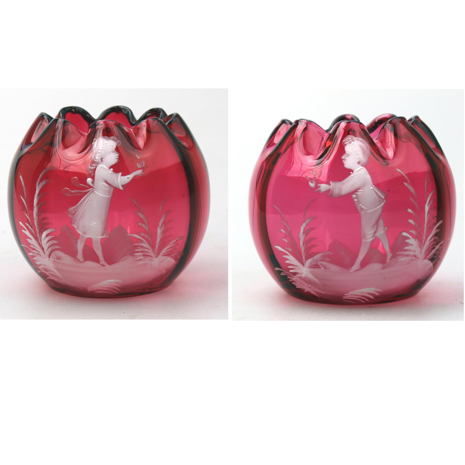Pair of Cranberry Coloured Glass Mary Gregory Type Vases c.1900
