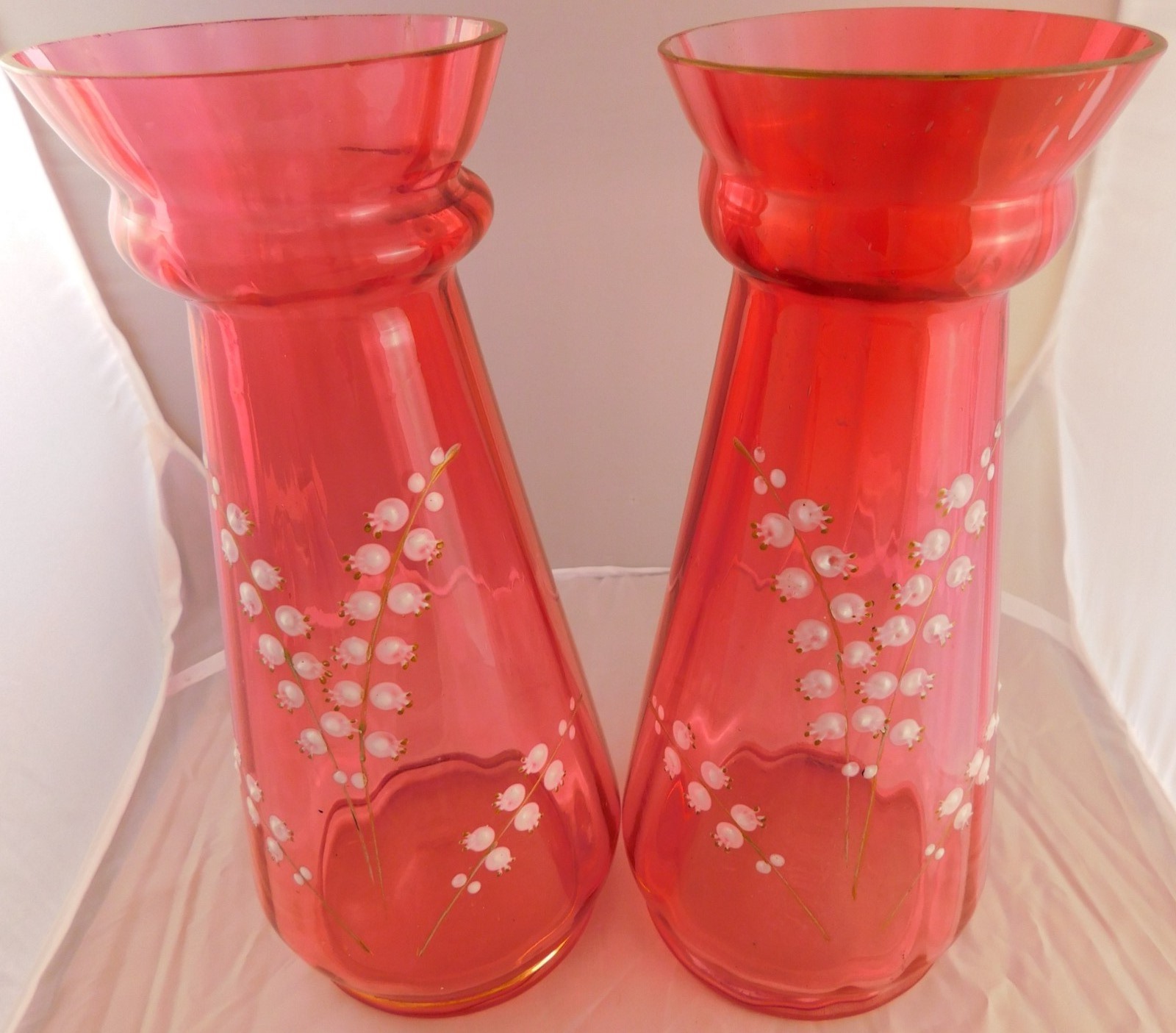 Pair of Cranberry Vases Decorated with Lily of the Valley