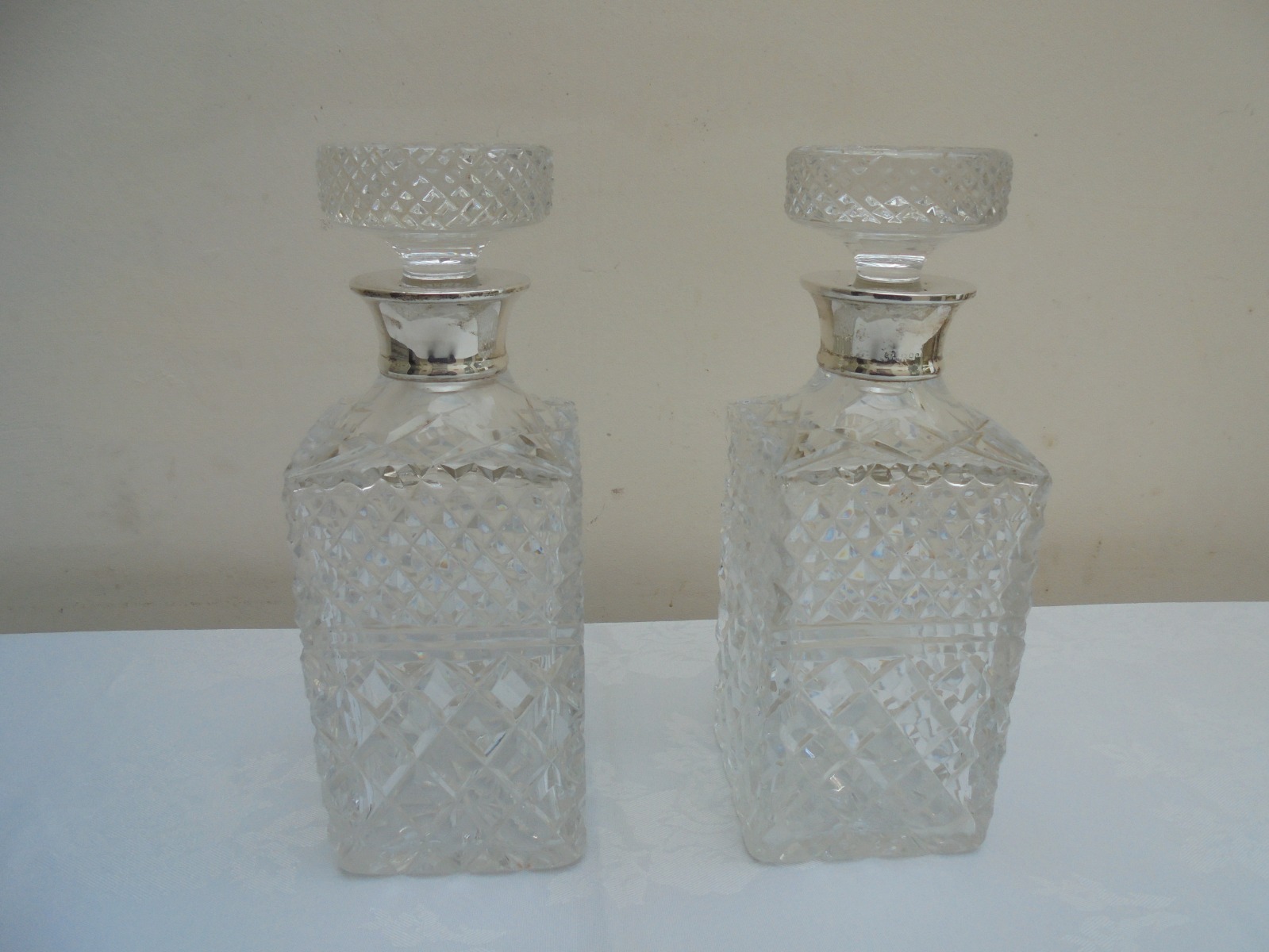 Pair of Cut Glass Silver Top Square Decanters