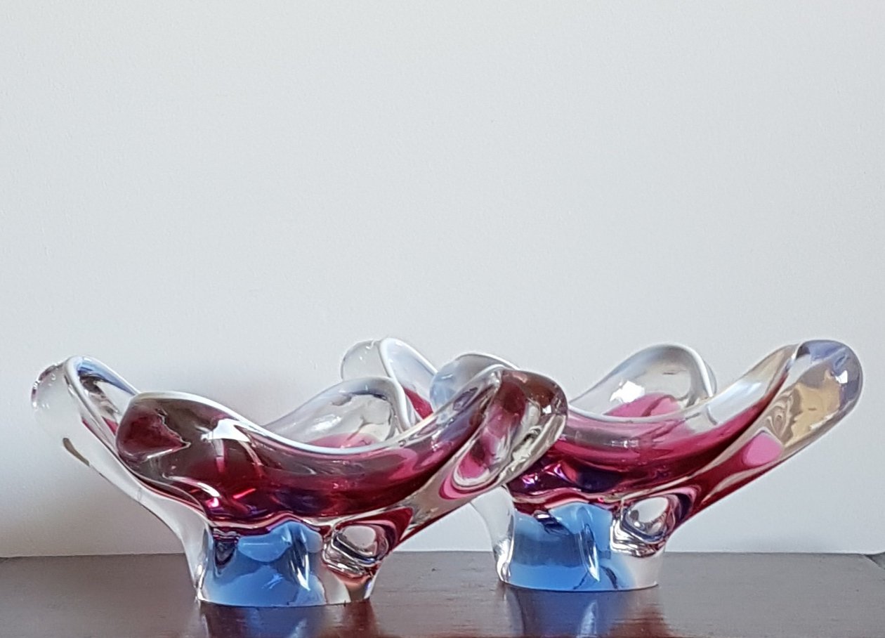 Pair of Czech Chribska Op Art Pink, Blue & White Trim Lobed Dishes, by Josef Hospodka