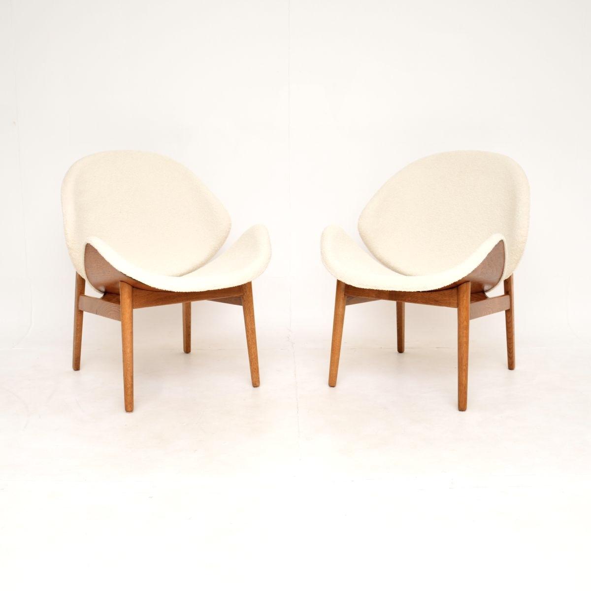 A stunning and iconic pair of Danish vintage lounge chairs by Hans Olsen. They were made by N.A Jorgensen in Denmark, and date from the 1960s. This is the model 134 orange chair, so called as it resembles a peeled orange from the back. The quality is outstanding, they are petite yet surprisingly very comfortable. The shell backs and seats are made from teak, the frames are solid oak. We have had the wood stripped and re-polished to a very high standard, they have been beautifully re-upholstered in a lovely soft cream boucle fabric. The condition is superb for their age. Width – 61cm , 24 inches Depth – 69cm, 27 inches Height – 79cm, 31 inches Seat Height – 41cm, 16 inches