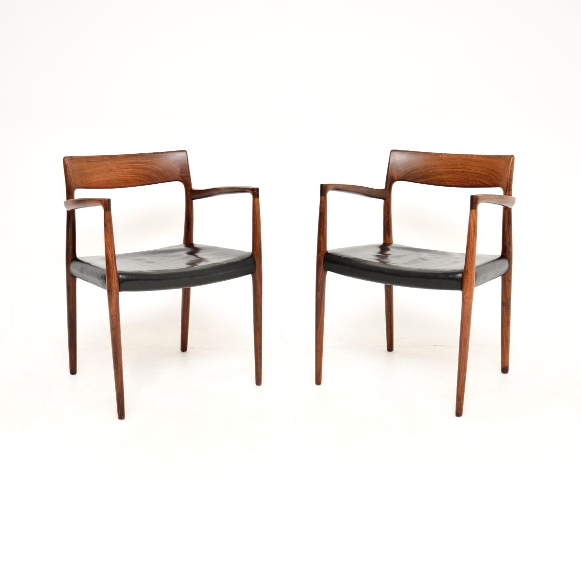 An exceptional pair of Danish vintage rosewood model 57 chairs by Niels Moller. They were made in Denmark by JL Moller Mobelfabrik, they date from the 1960’s.