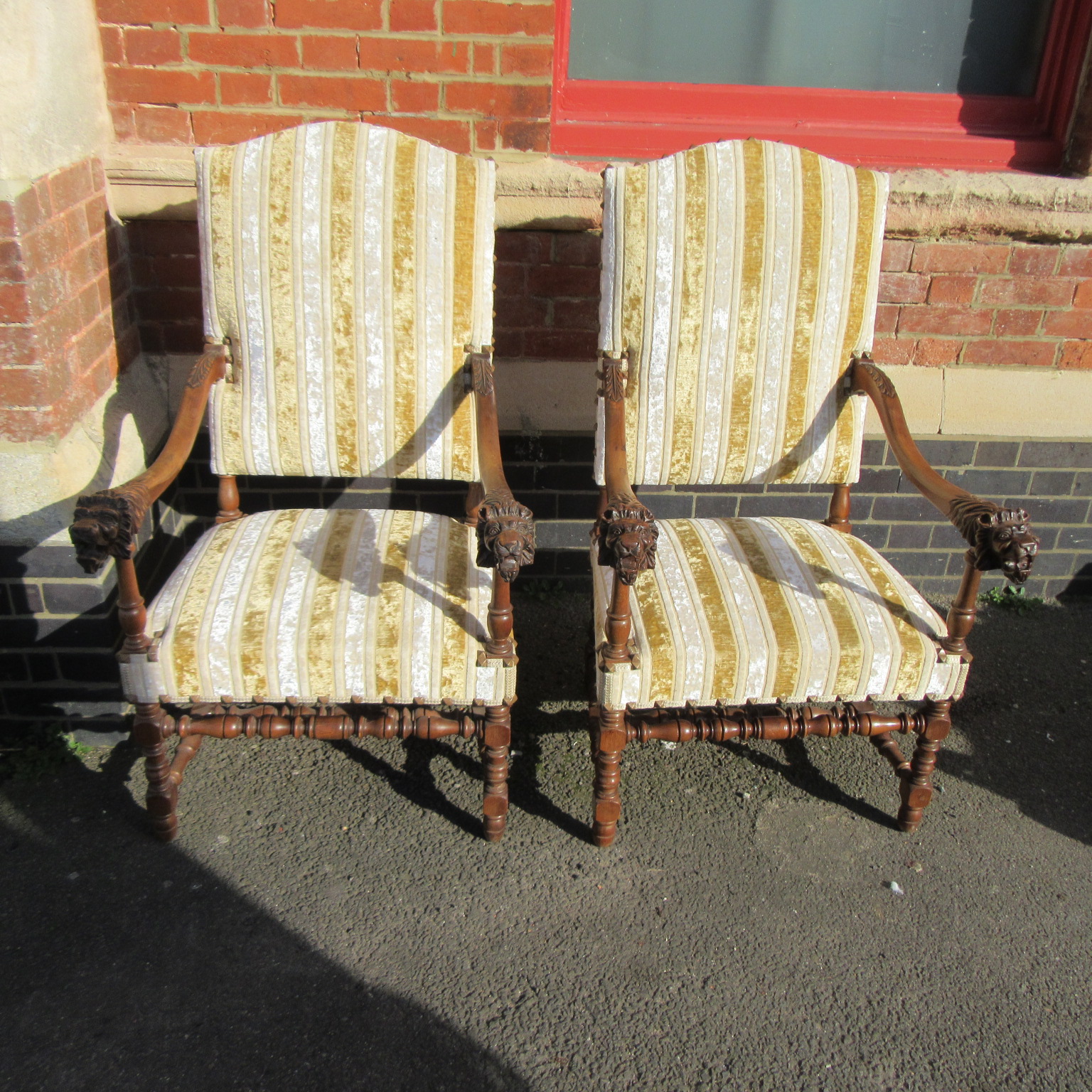 Pair of Decorative Antique French Oak Open Armchairs c.1880