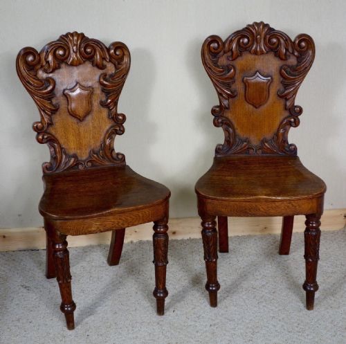 Pair of Decorative Victorian Carved Oak Hall Chairs