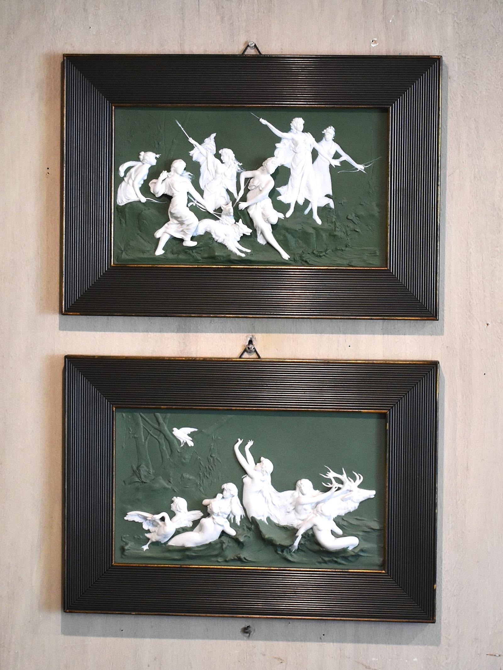 A superb pair of Dresden wall plaques in the Art Nouveau manner. The plaques are created in two tone colours, sage green and pure white with the figures modelled in high relief, including some that are almost threequarters free of the base. The scenes both show classical figures and animals and are Neoclassical in tone but also have the sinuous curves of the Art Nouveau. The pair both have an impressed Dresden mark with a shield motif, an unusual mark that I have been unable to definitively identify. The plaques are in excellent original condition and also retain the original green colour frames. A rare, fine and decorative pair of plaques. C.1900.