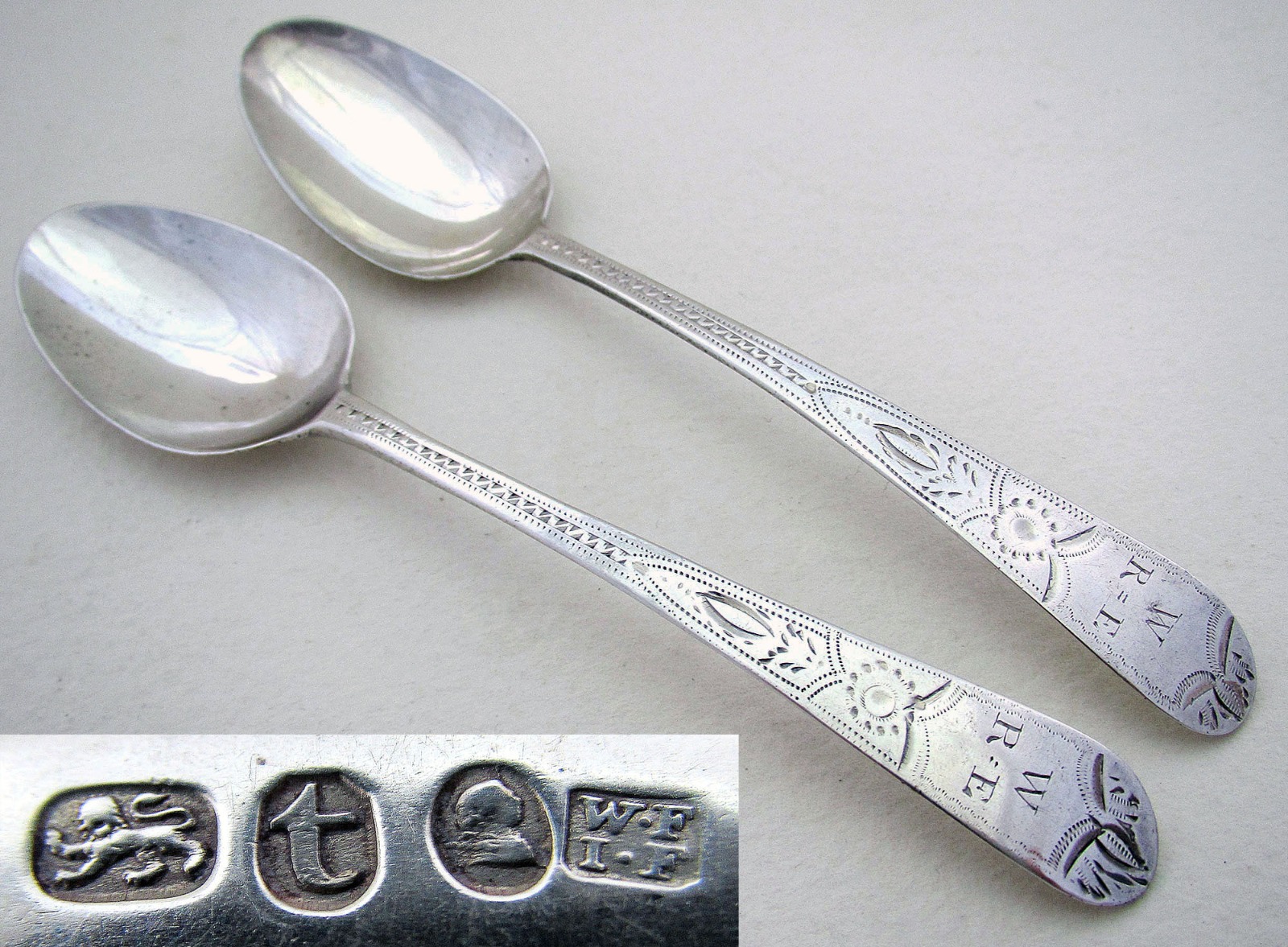 Pair of Early, 1794 George III Solid Sterling Silver Bright-Cut Antique Tea Spoons, William & John Fisher, Old English Pattern