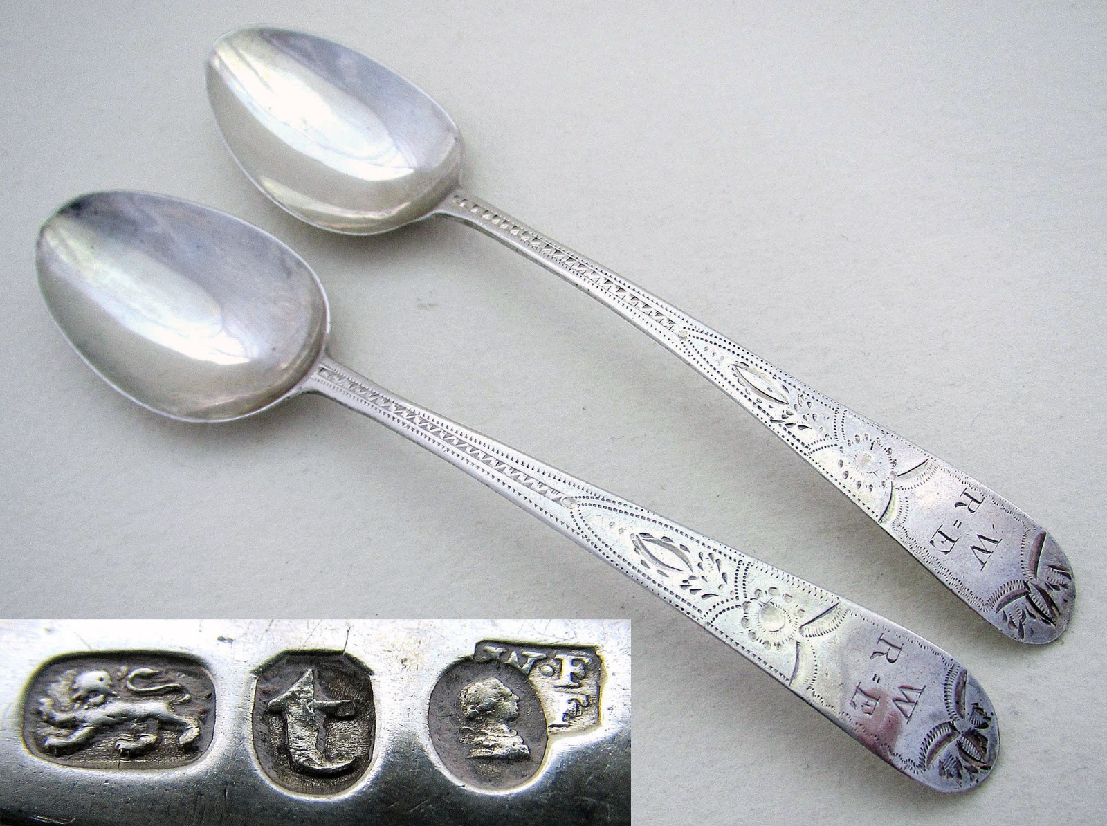 Pair of Early, 1794 George III Solid Sterling Silver Bright-Cut Antique Tea Spoons, William & John Fisher, Old English Pattern