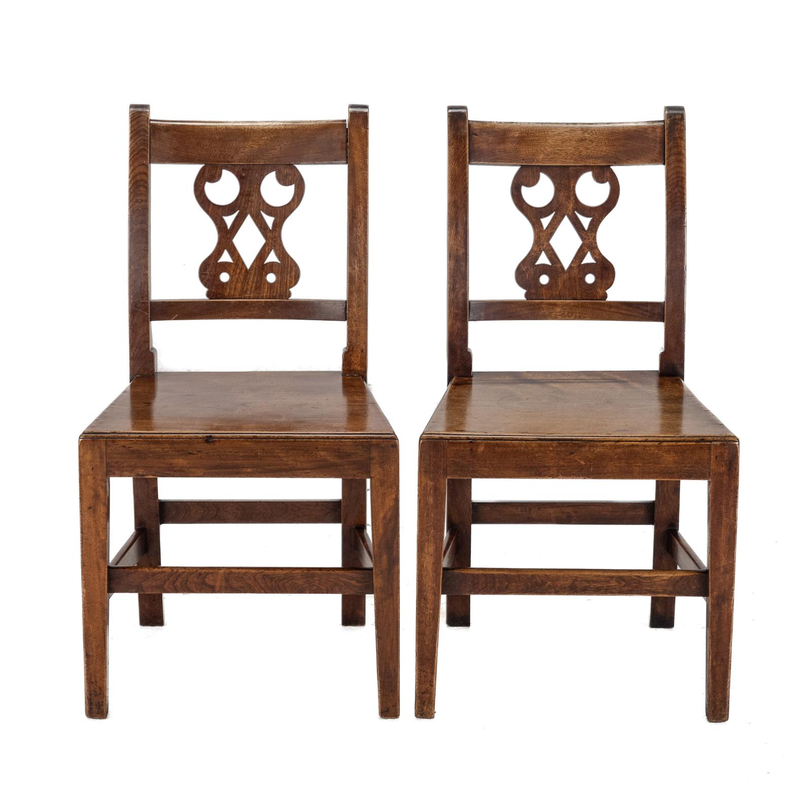 A characterful pair of early 19th century English country chairs, dating to the George III period, circa 1800–1820. Predominantly constructed in elm, with typical mixed secondary timbers, each chair features a solid plank seat and a pierced splat back, offering a slightly more decorative variation on the traditional country chair form.