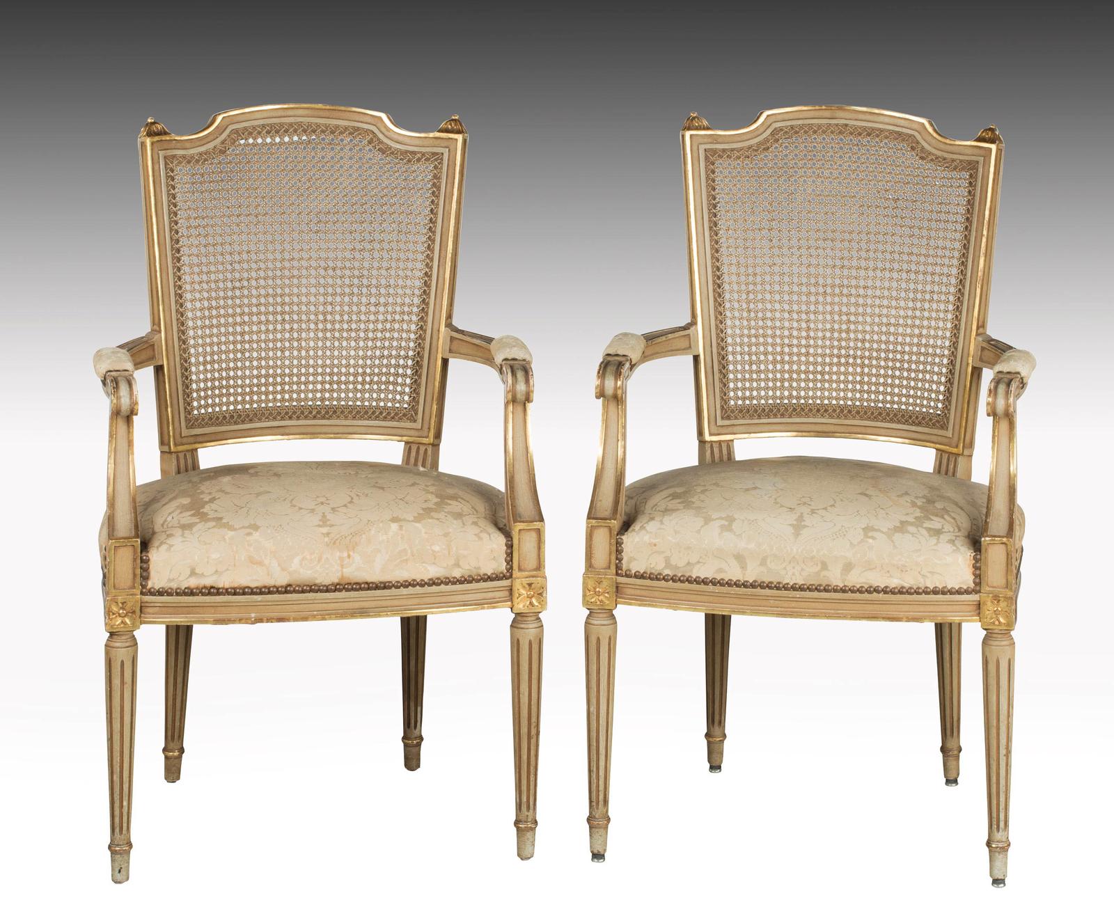 Pair of Early 20th Century French Painted & Parcel Gilt Elbow Chairs