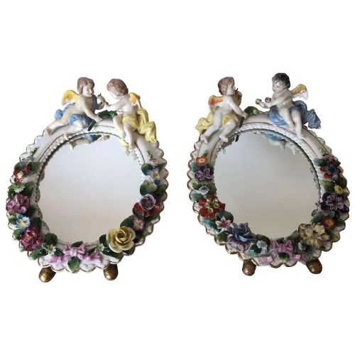 Pair of Early 20th Century German Sitzendorf Porcelain Cherub Barbola Mirrors