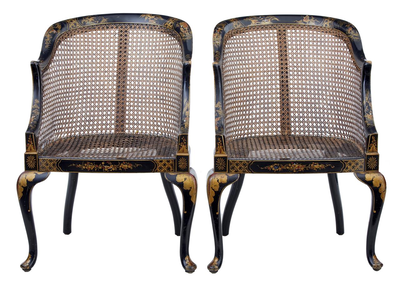 Pair of Early 20th Century Lacquered Chinoiserie Cane Chairs