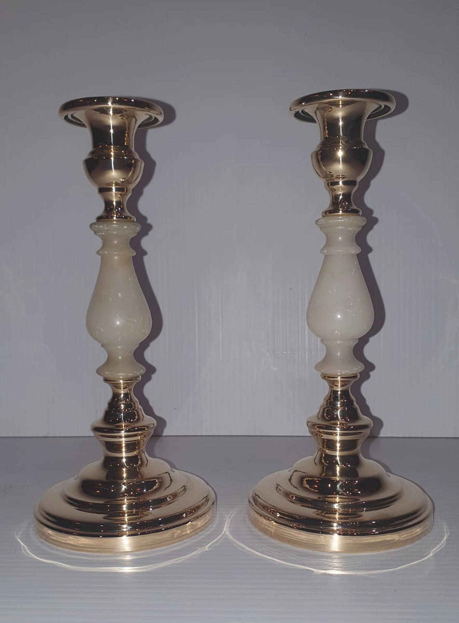 Pair of Early 20th Century Polished Brass & Alabaster Candlesticks