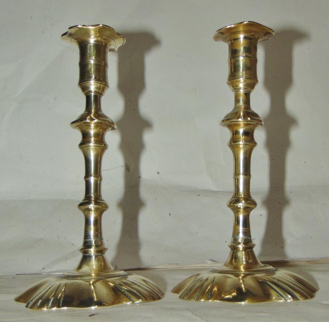 Pair of Early Georgian Petal Base Brass Candlesticks