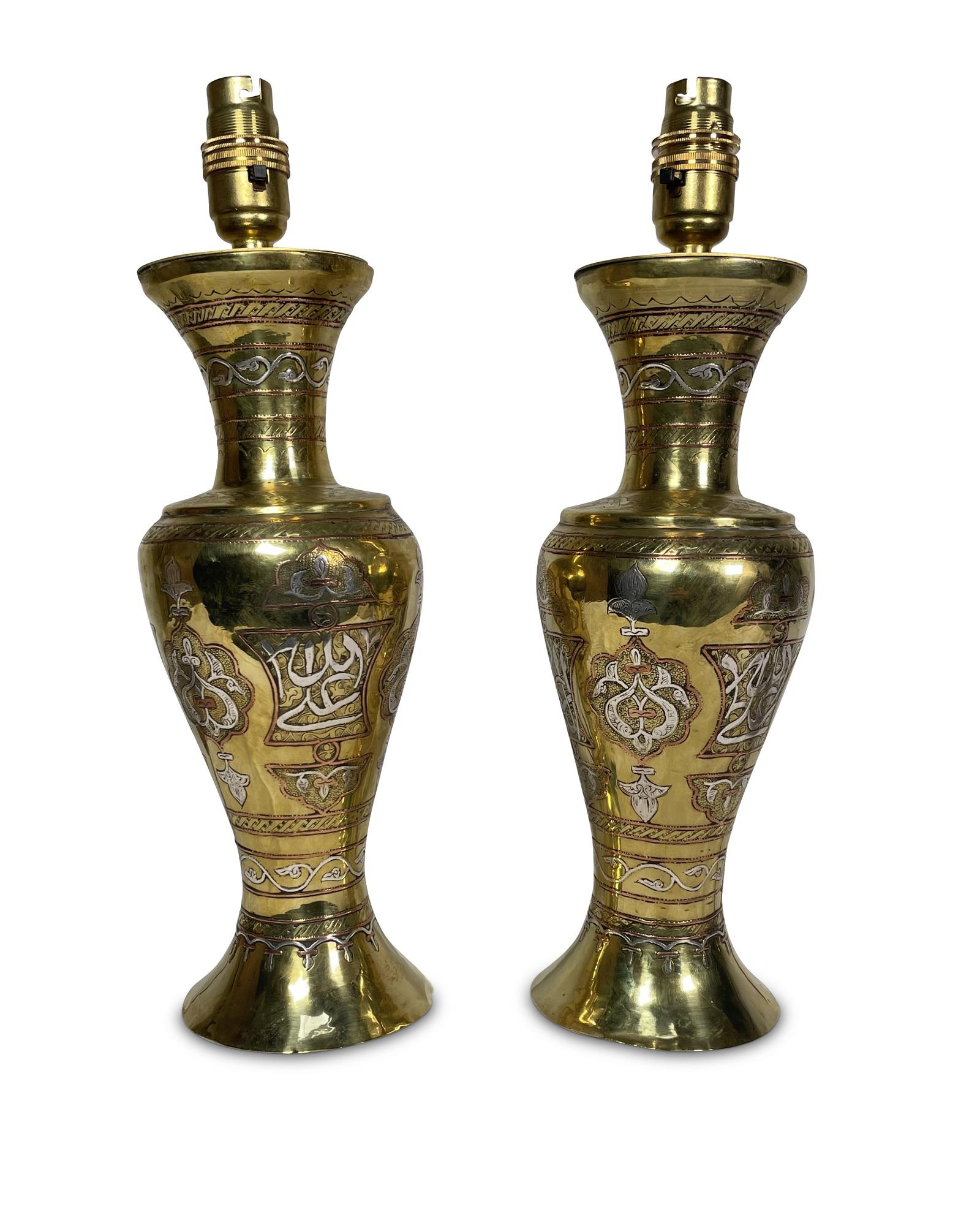 Pair of Eastern Brass Vases Converted to Table Lamps