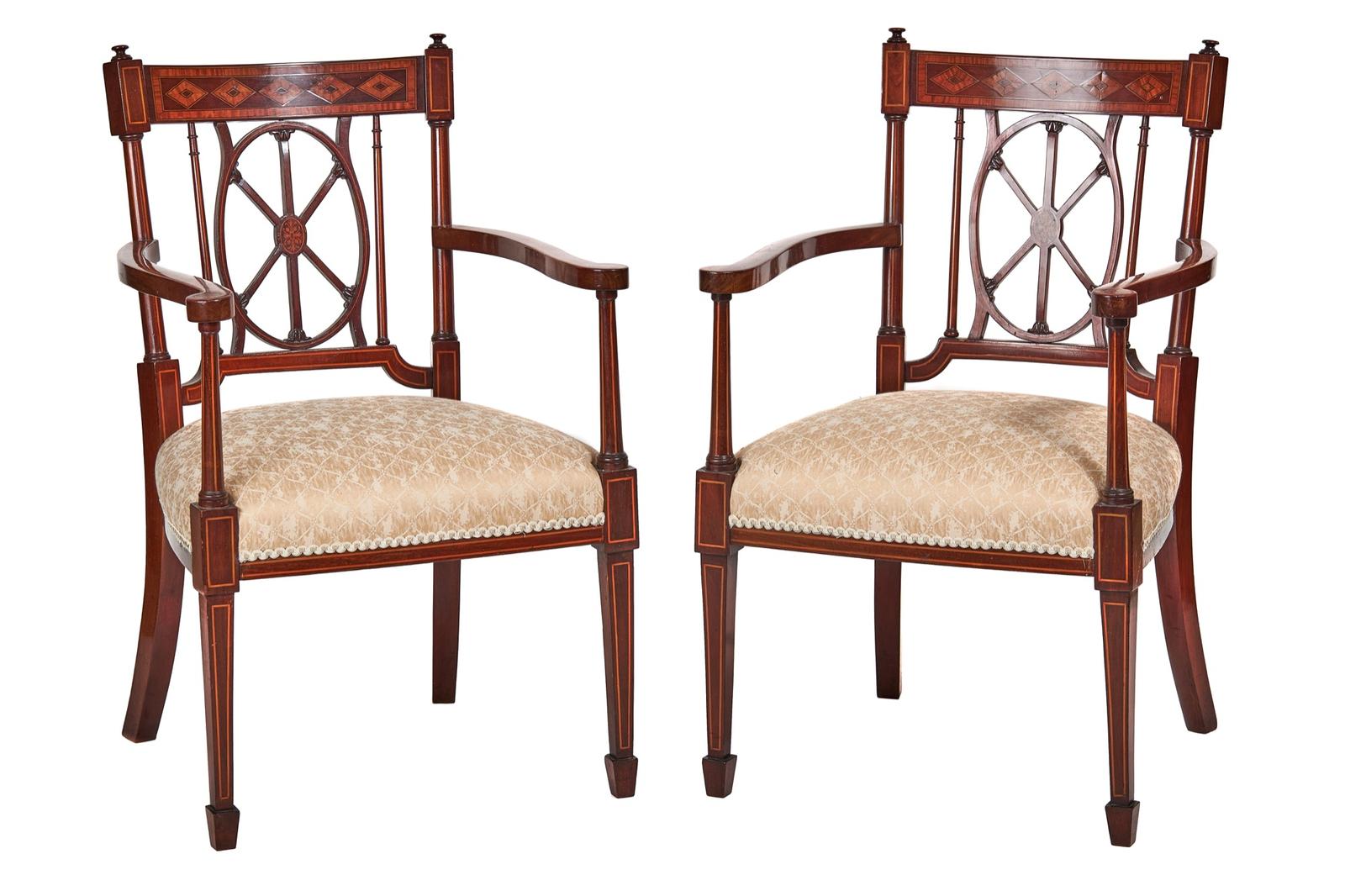 Pair of Edwardian Mahogany & Inlaid Elbow Chairs