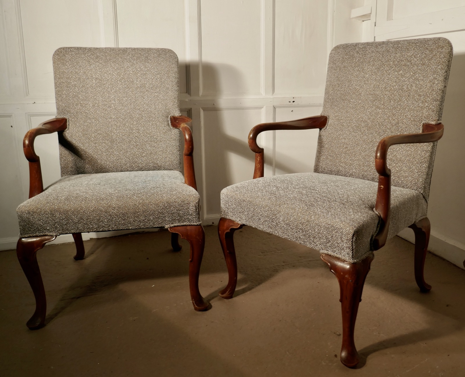 Pair of Elegant Edwardian Tweed Upholstered Fireside Chairs
