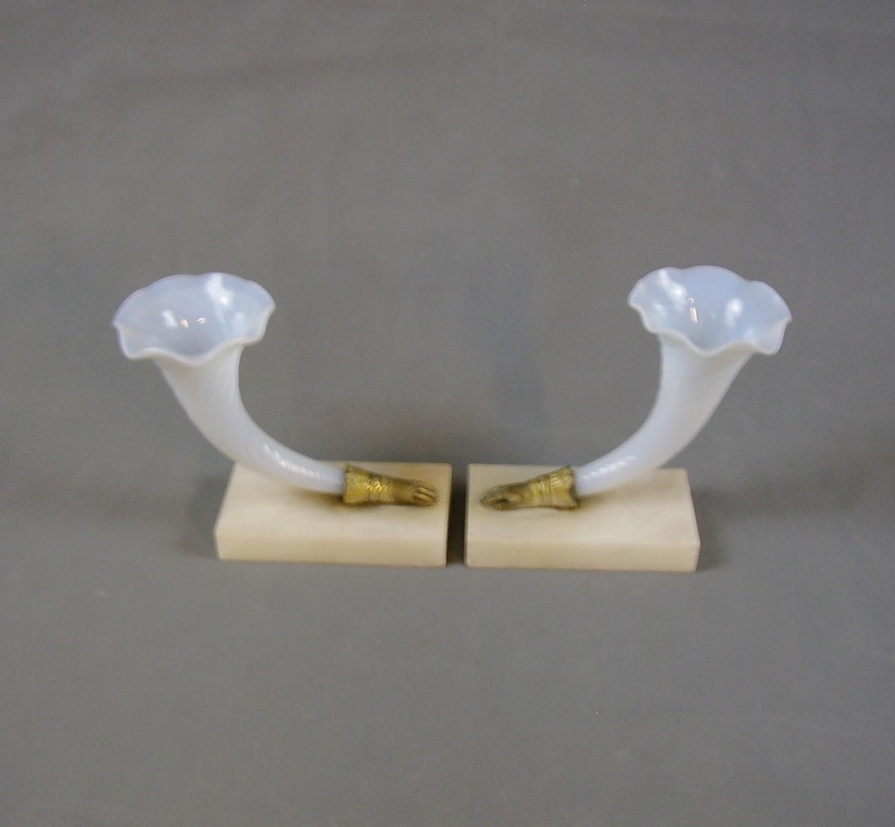 Pair of Elegant Regency Milk Glass Cornucopia on White Marble Bases