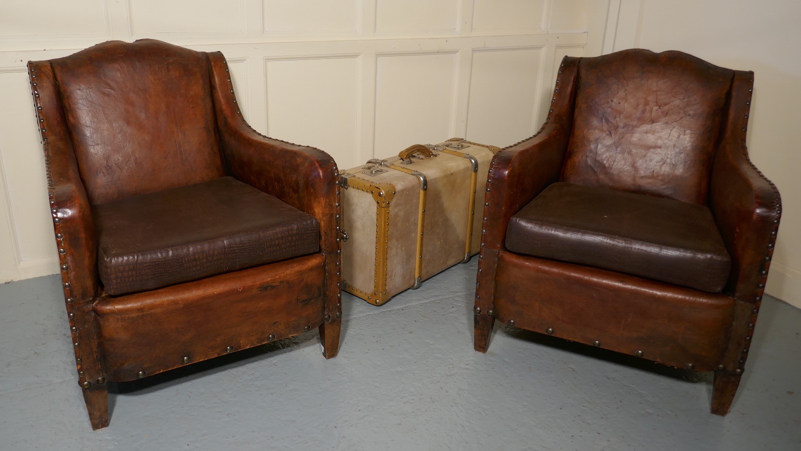 Pair of Elegant Shabby French Art Deco Leather Club Chairs