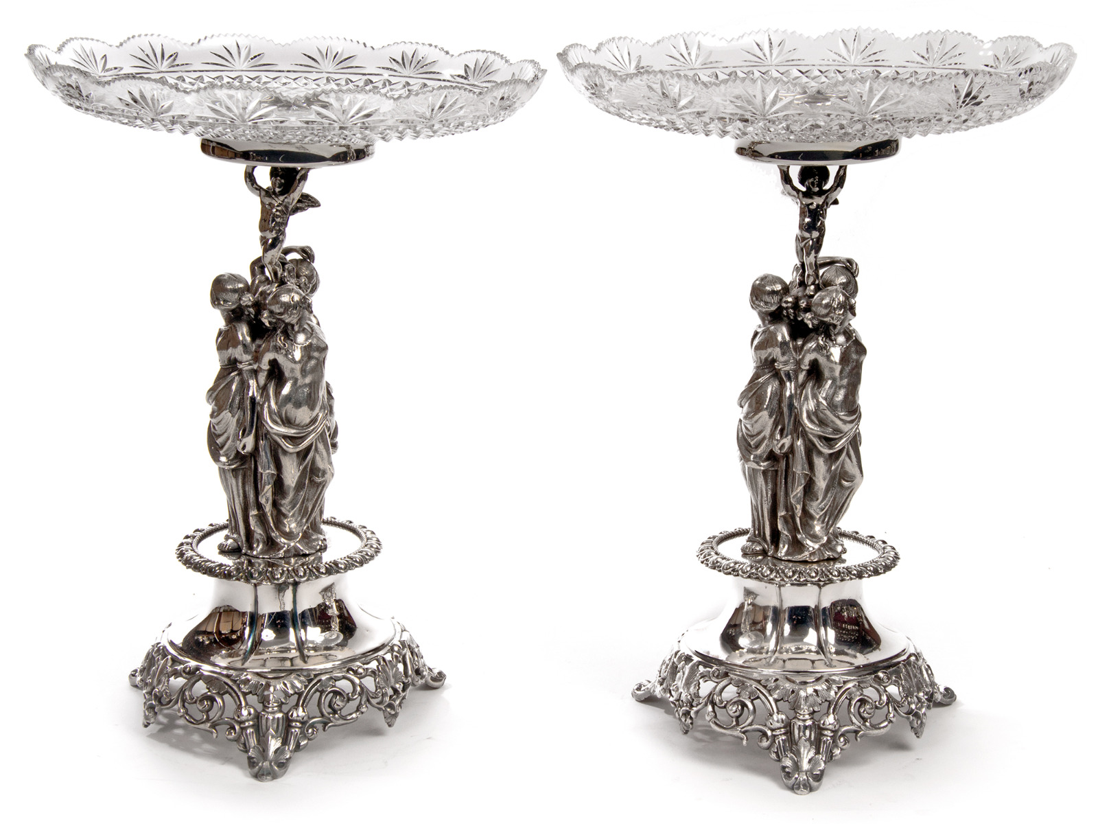 Pair of Elegant Silver Plate Comports Depicting Three Female Figures and a Cherub (1 of 1)