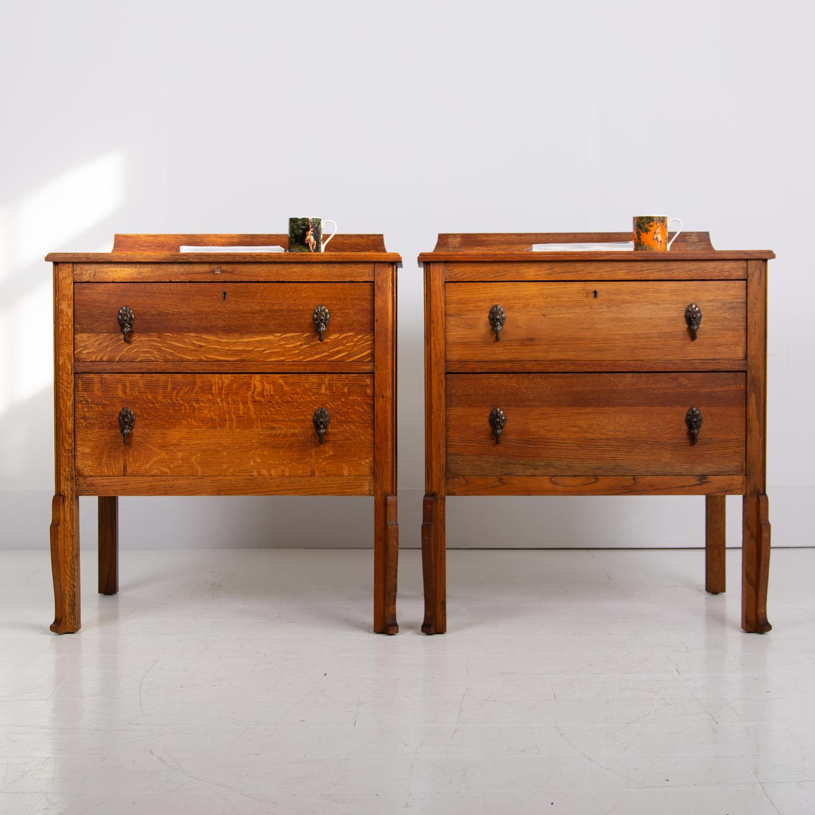 Super scale to this pair of handsome chaps, perfect for bedside cabinets or maybe a living room. Never easy to find these sitting in a lovely condition with a well shaped oversailing solid oak top, delightful shaped front legs and two graduated drawers with toggle drop pendant handles with casting numbers to the rear.