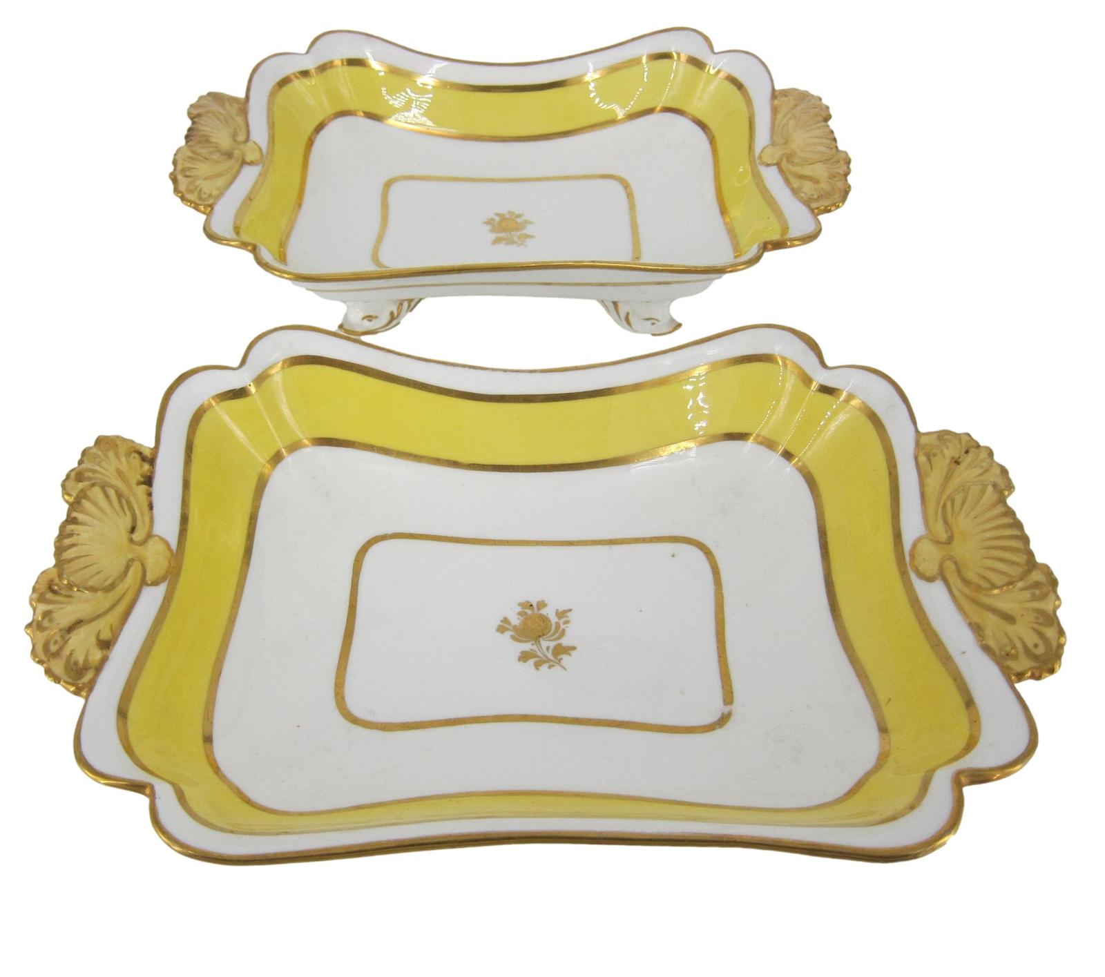 Pair of English Porcelain Yellow & Gilt Rectangular Dishes on 4 Dolphin Feet