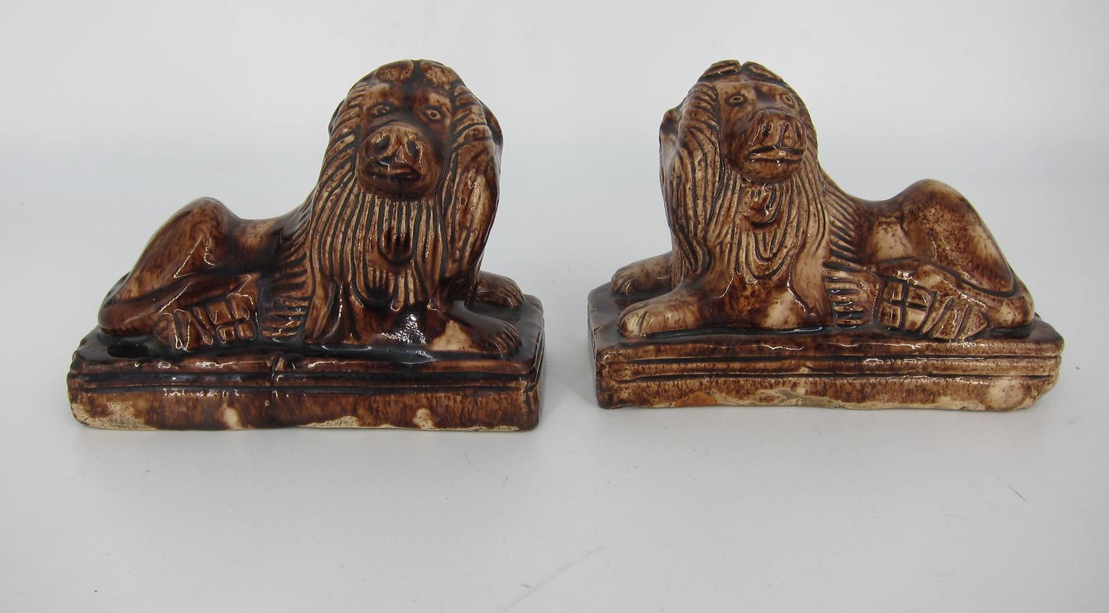 Pair of English Pottery Treacle Glaze 4.00" Lions