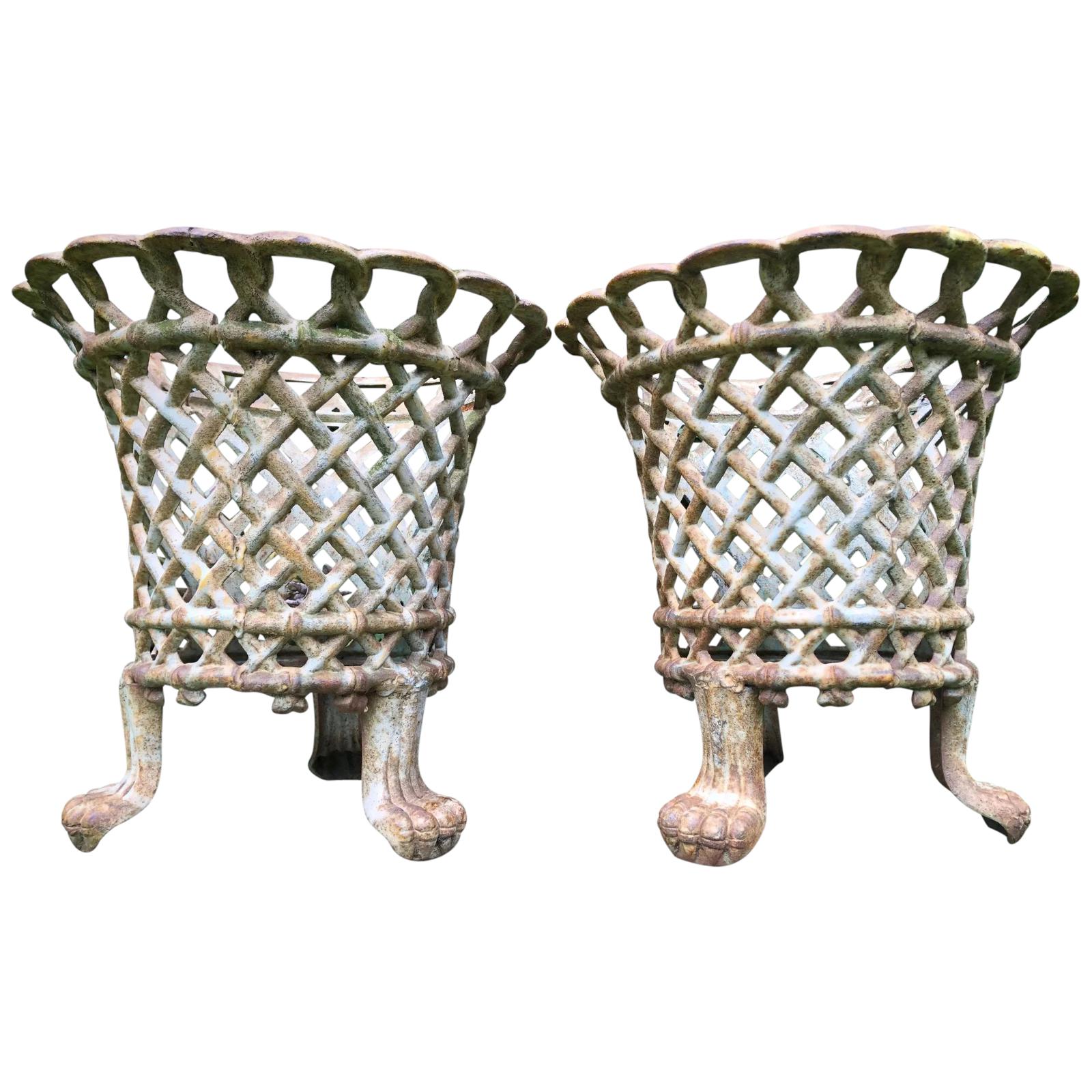 Pair of Fine Antique Edwardian Garden Cast Iron Lattice Urn Planters on 3 Lion Feet