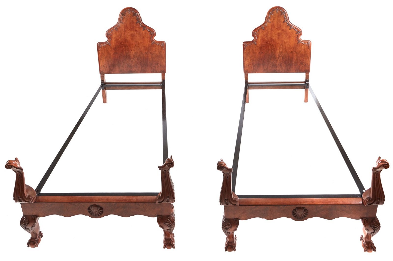 Pair of Fine Quality Carved Burr Walnut Single Beds c.1920 (1 of 9)