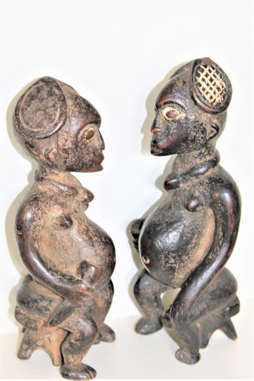 Pair of Finely Carved Wood Yoruba Figures with Elaborate Headdress Both Seated on Turtles