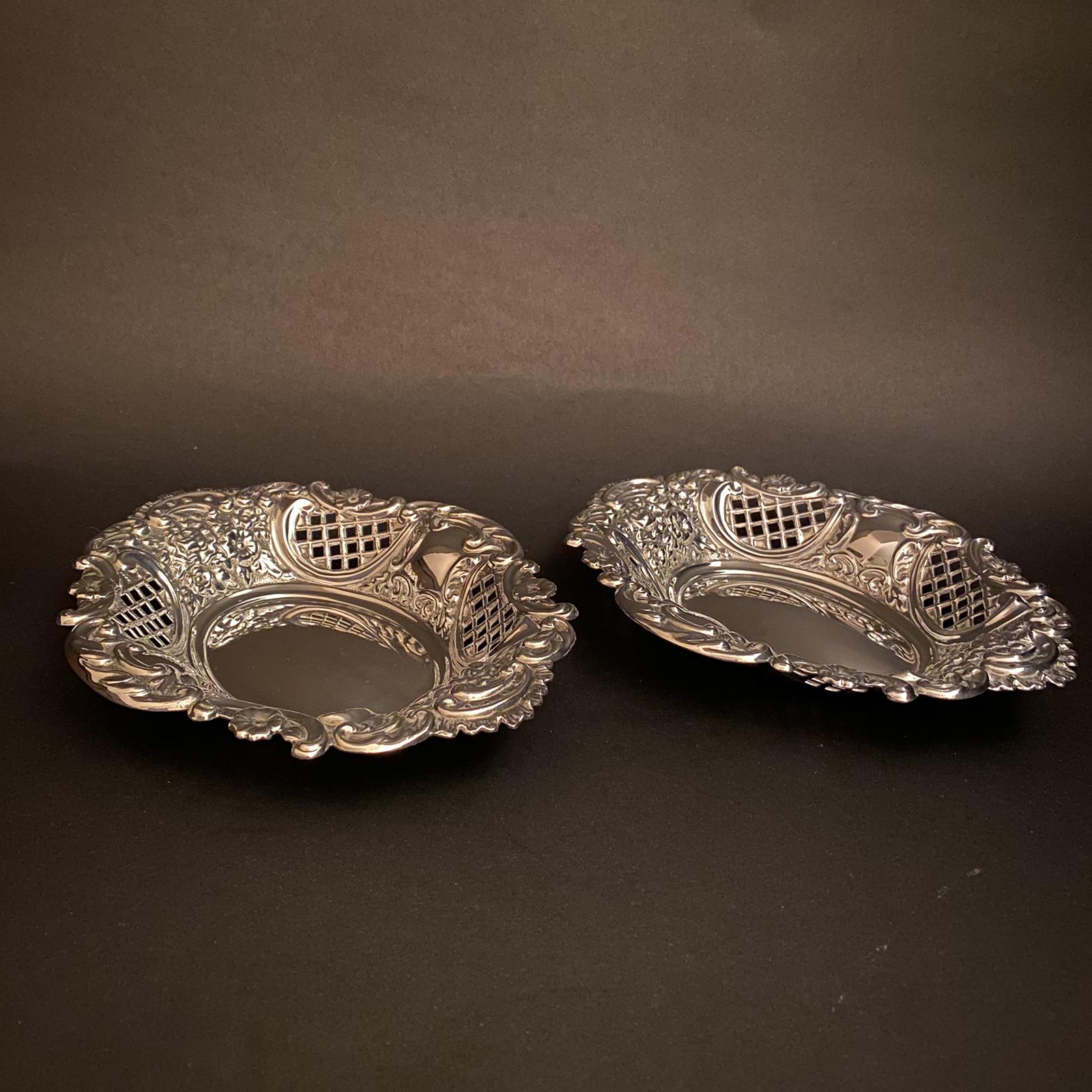 Pair of Flat Silver Swags Flowers & Grille Bon Bon Dishes