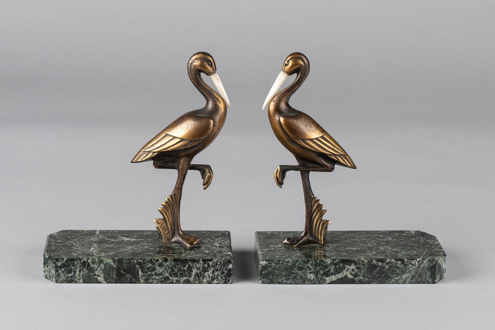 Pair of French Art Deco Bronze Stork Bookends, signed GUAL