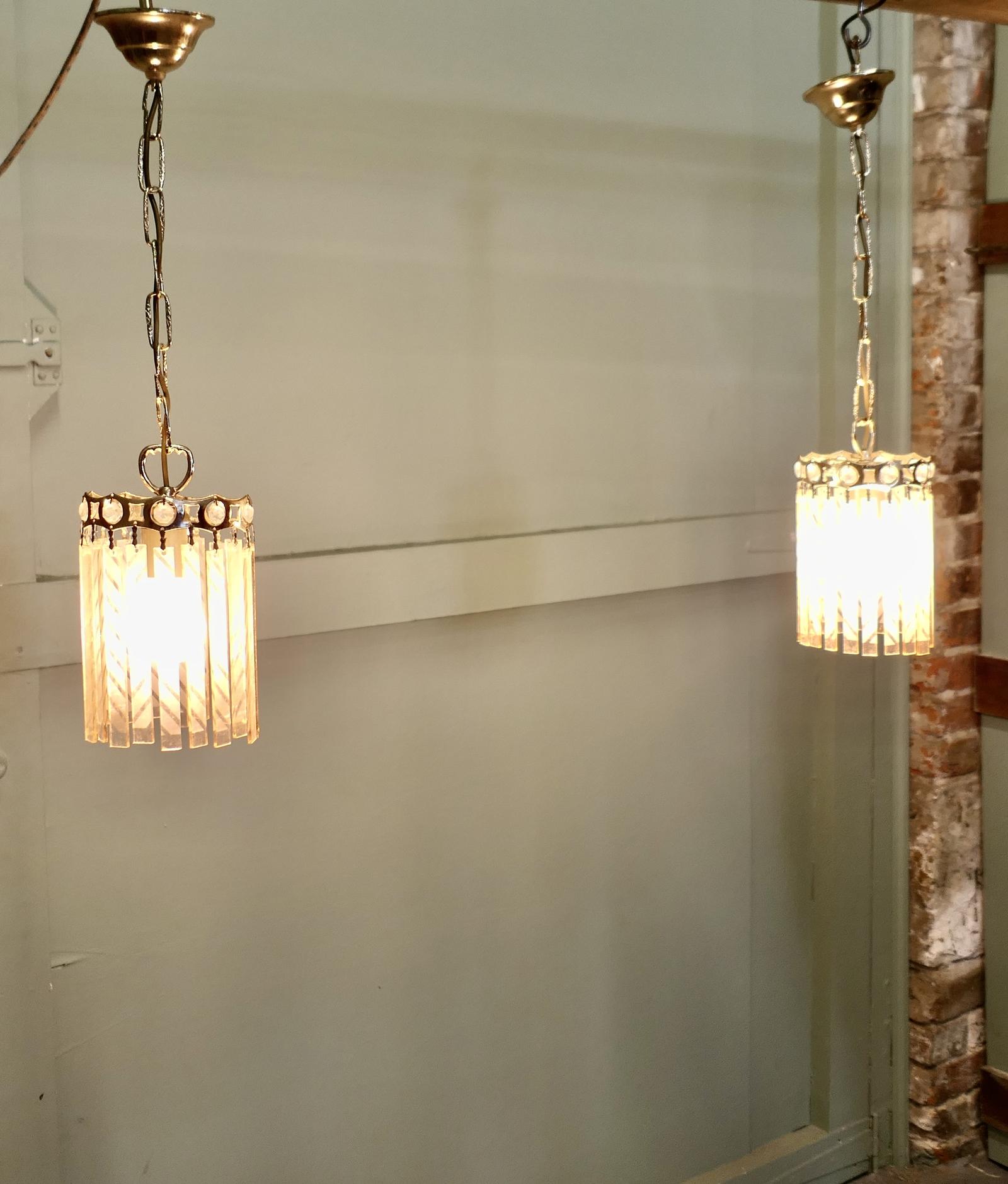 These lovely lights are round they have flat peach glass pendants etched with chevrons and they hang around a gilt brass frame. The lanterns give a delicate pink light when alight, they hang on a chain and brass rose.