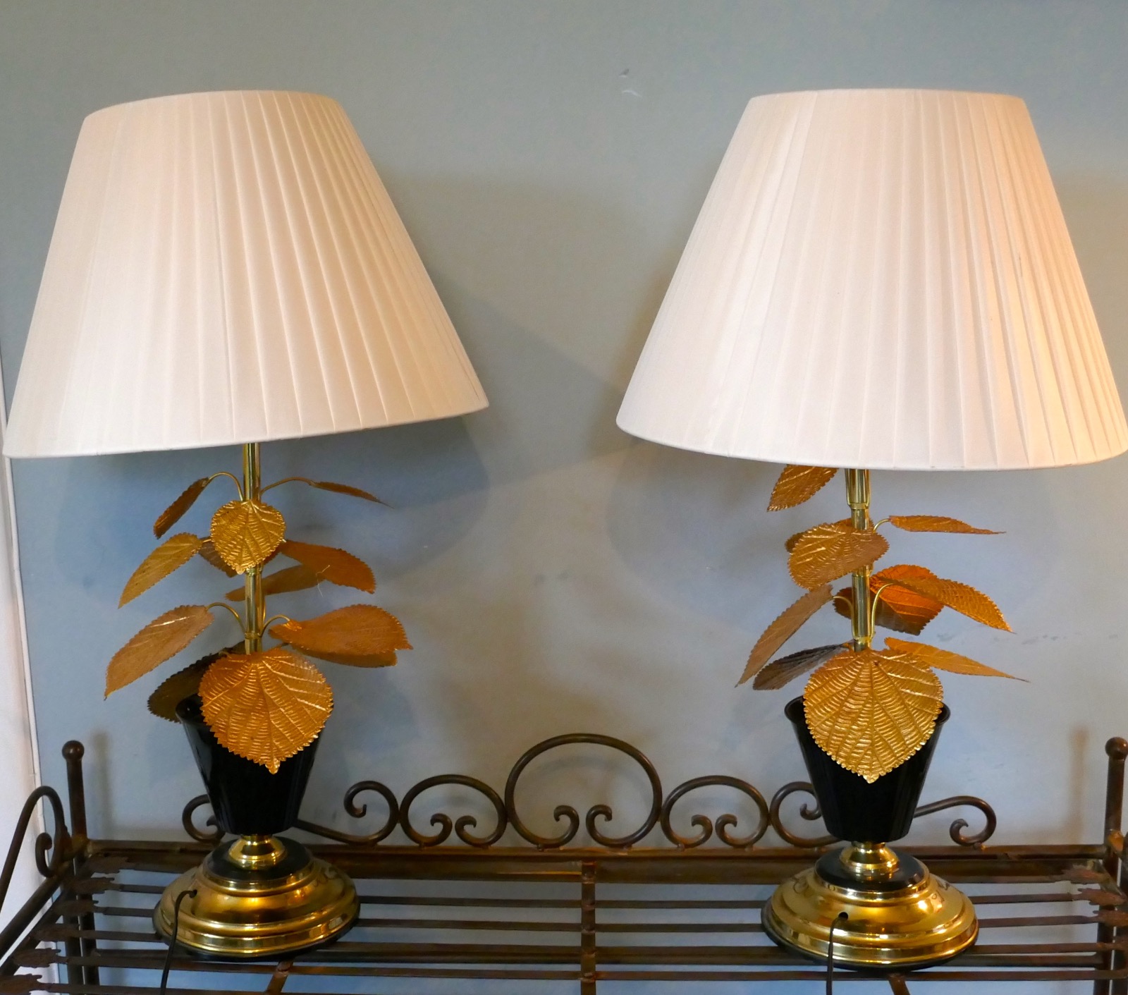 Pair of French Art Deco Table Lamps, Decorated with Brass Leaves