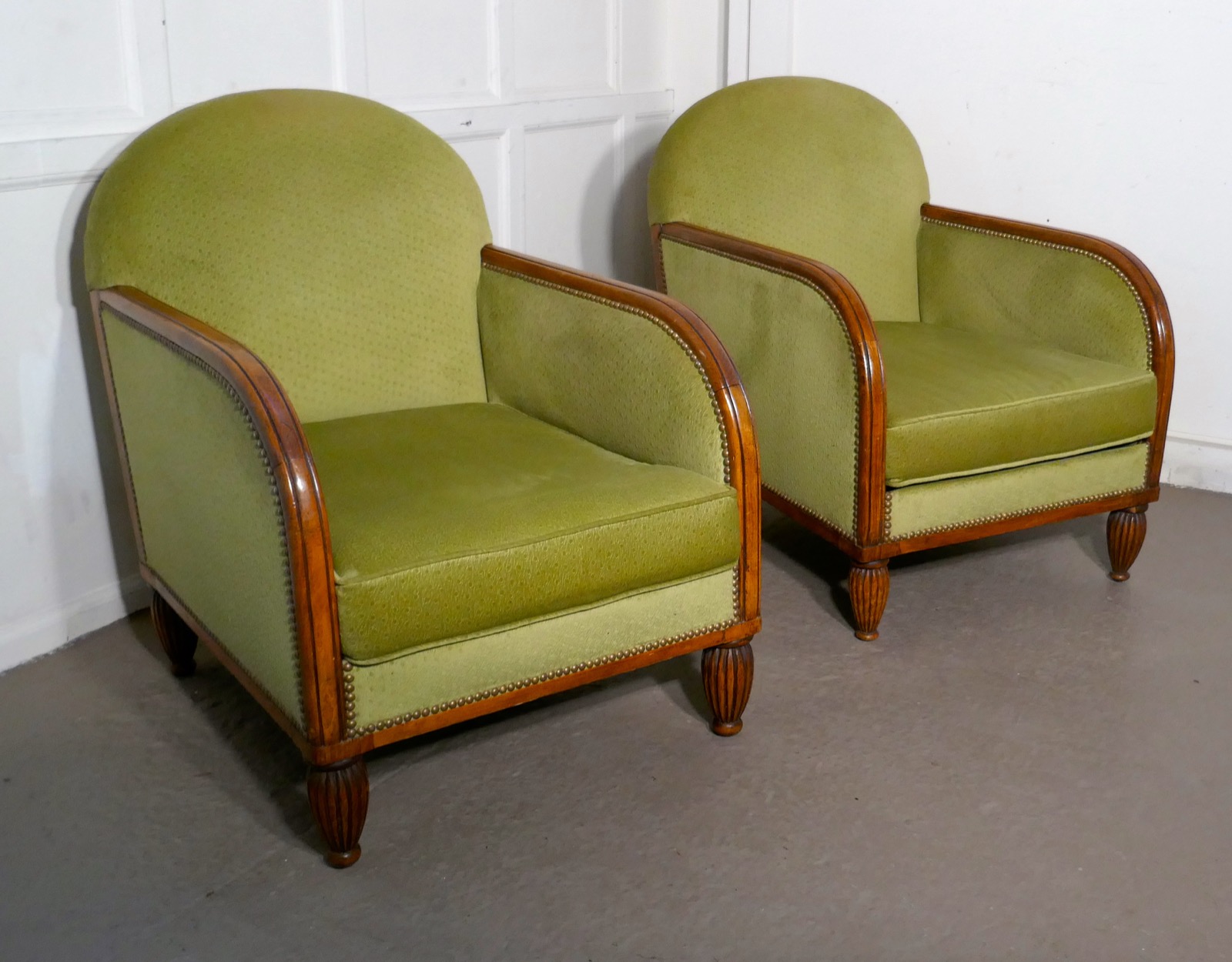 Pair of French Art Deco Walnut Upholstered Club Chairs