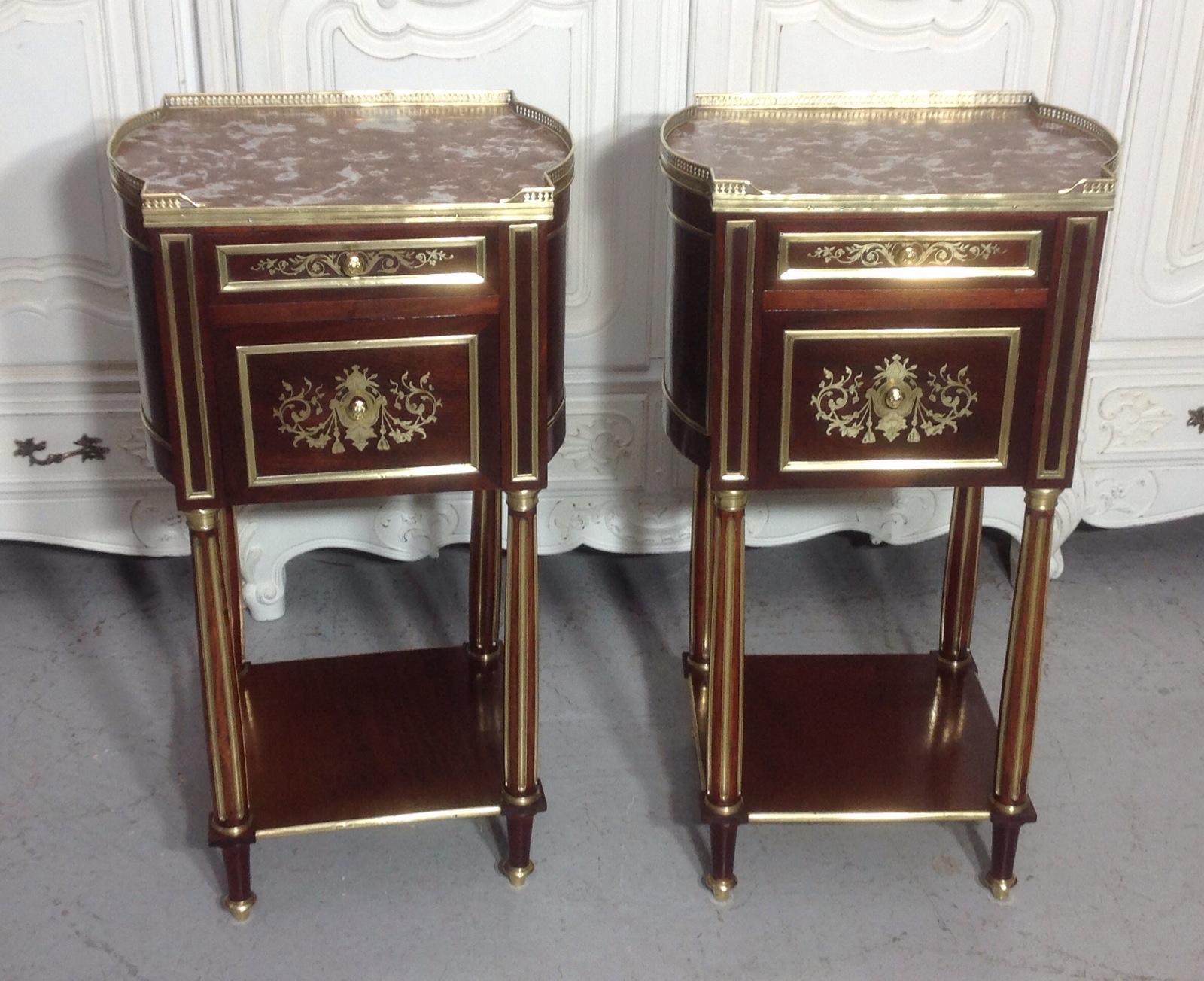 Pair of French Brass & Mahogany Bedside Cabinets